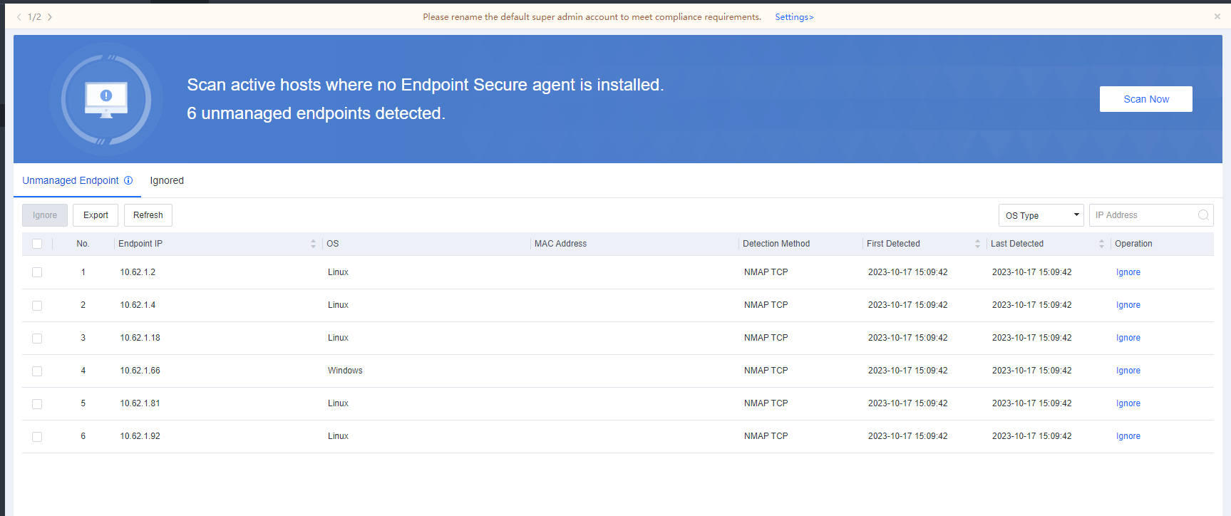 Endpoint Secure Manager recognizes the first interface as the management interface, with a default IP address of 10.251.251.251/24. Create or configure a virtual machine with an IP address within the 10.251.251.0/24 IP address range on the virtualization platform. Visit https://10.251.251.251 in a browser on the virtual machine, and log in using the default username "admin" and the default password "admin".