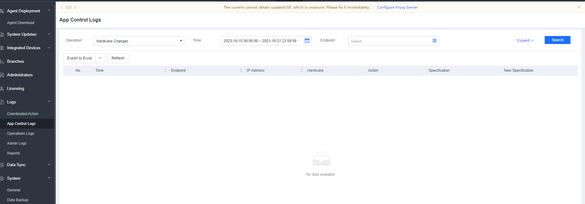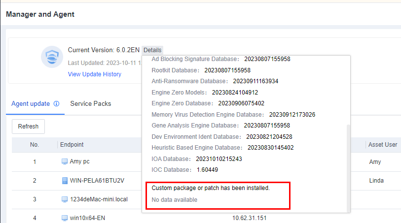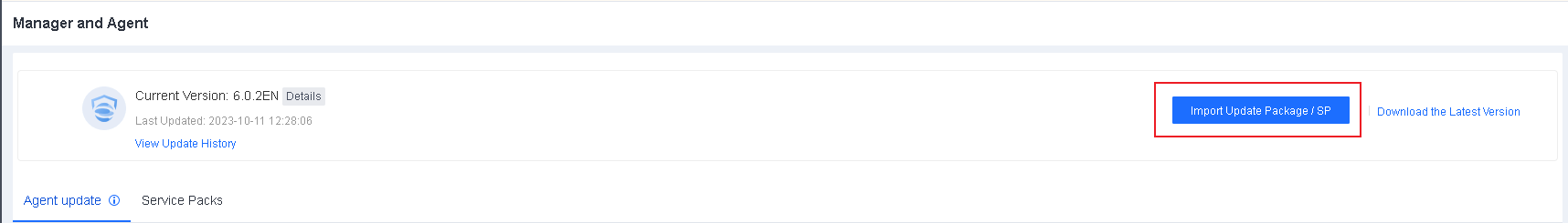 When an Endpoint Secure service pack is released, Endpoint Secure Manager can update it online, or you can manually import the service pack. To view the details of service pack update, go to System > System Updates > Manager and Agent > Service Packs.