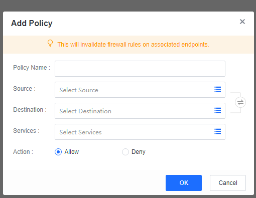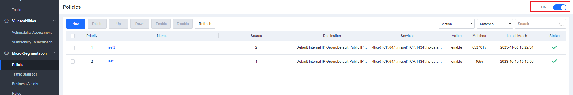 Log in to Endpoint Secure Manager. Go to Risk Assessment > Micro-Segmentation > Policies, and make sure the switch in the upper right corner is toggled on, as shown in the following figure.