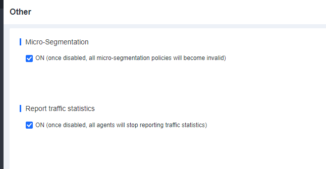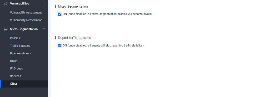 Log in to Endpoint Secure Manager. Go to Risk Assessment > Micro-Segmentation > Other, and make sure that the Report traffic statistics feature has been enabled, as shown in the following figure.