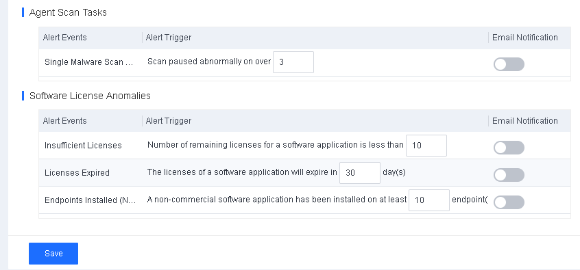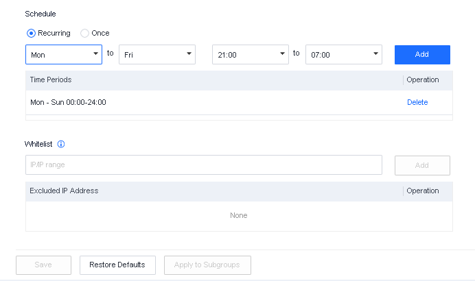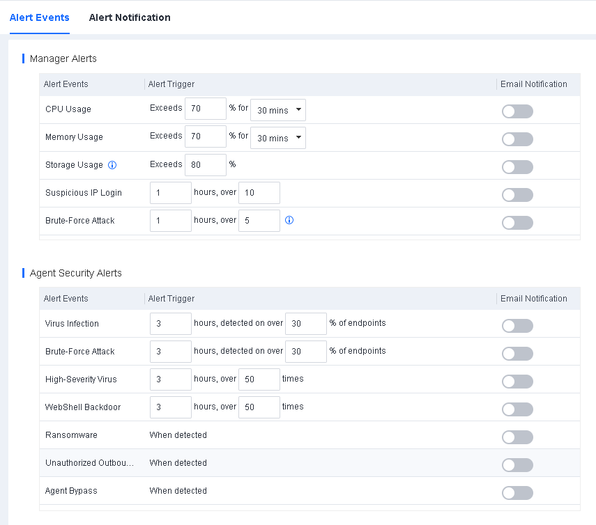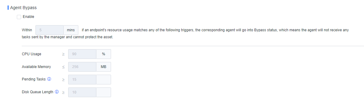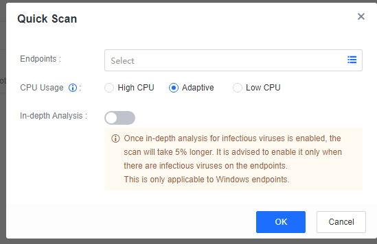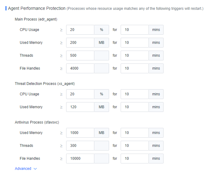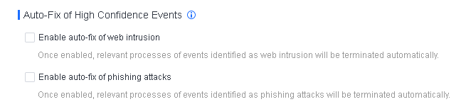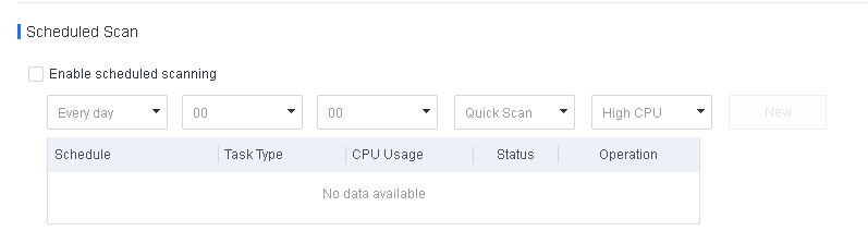 | Detection and Response | Anti-Malware | Scan Mode | When the server performance is insufficient, the scan mode is set to High CPU. | In High CPU mode, a scan consumes more endpoint CPU resources. This affects the system services if the server performance is insufficient. We recommend that you set the scan mode to Balanced by default. | High | When the server performance is insufficient, set the scan mode to Low CPU or Adaptive. |