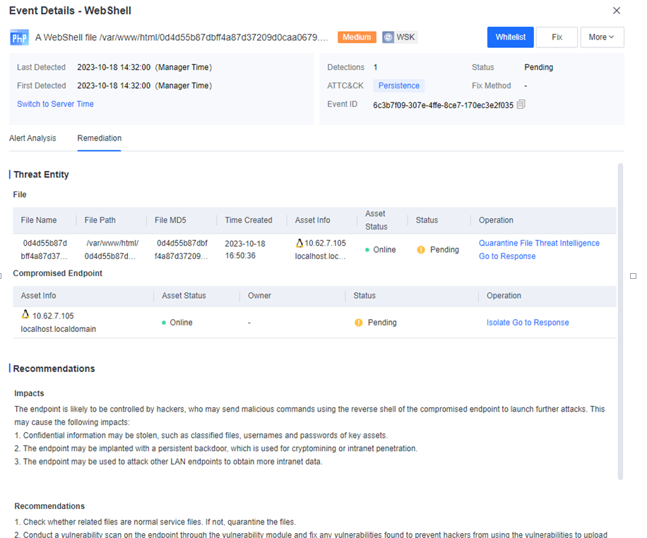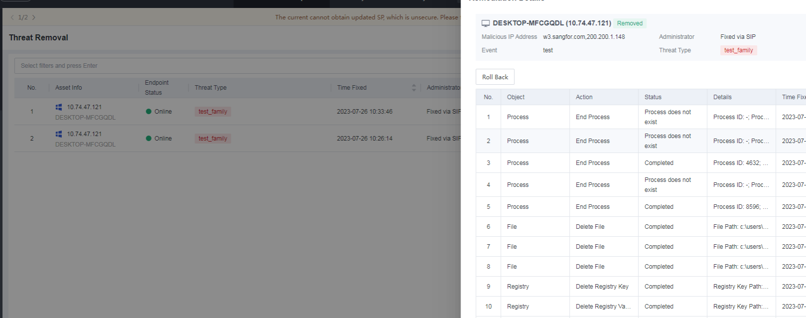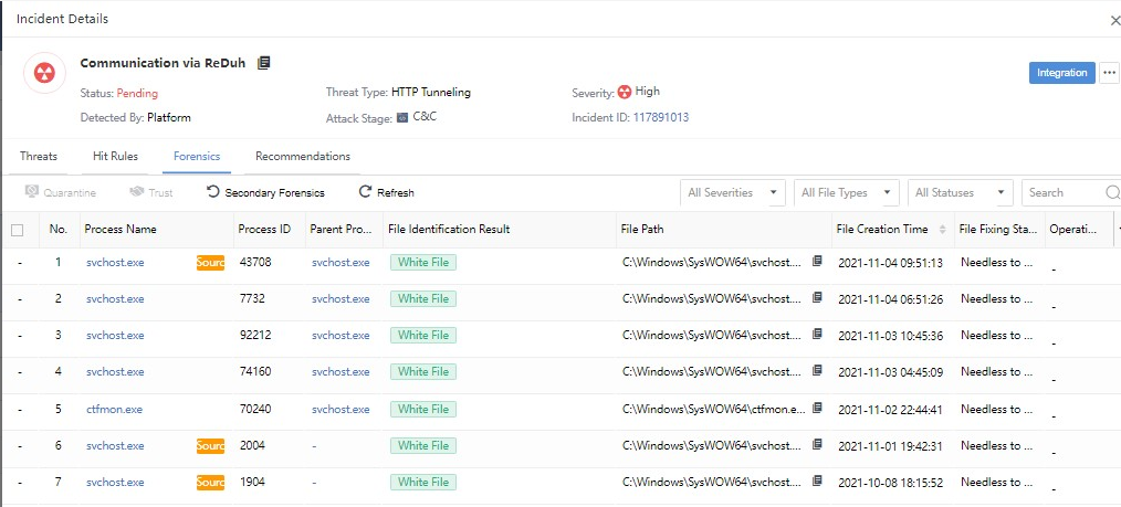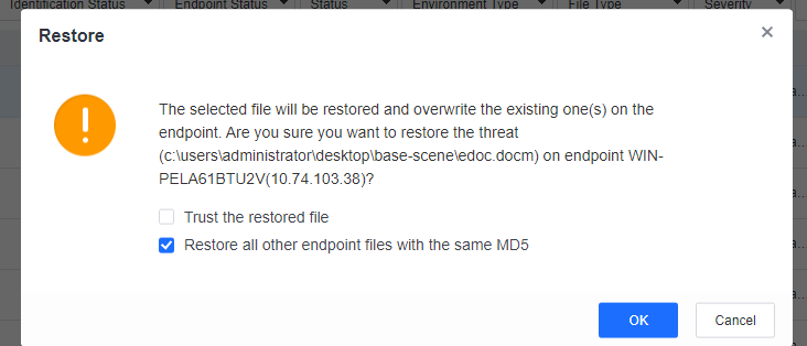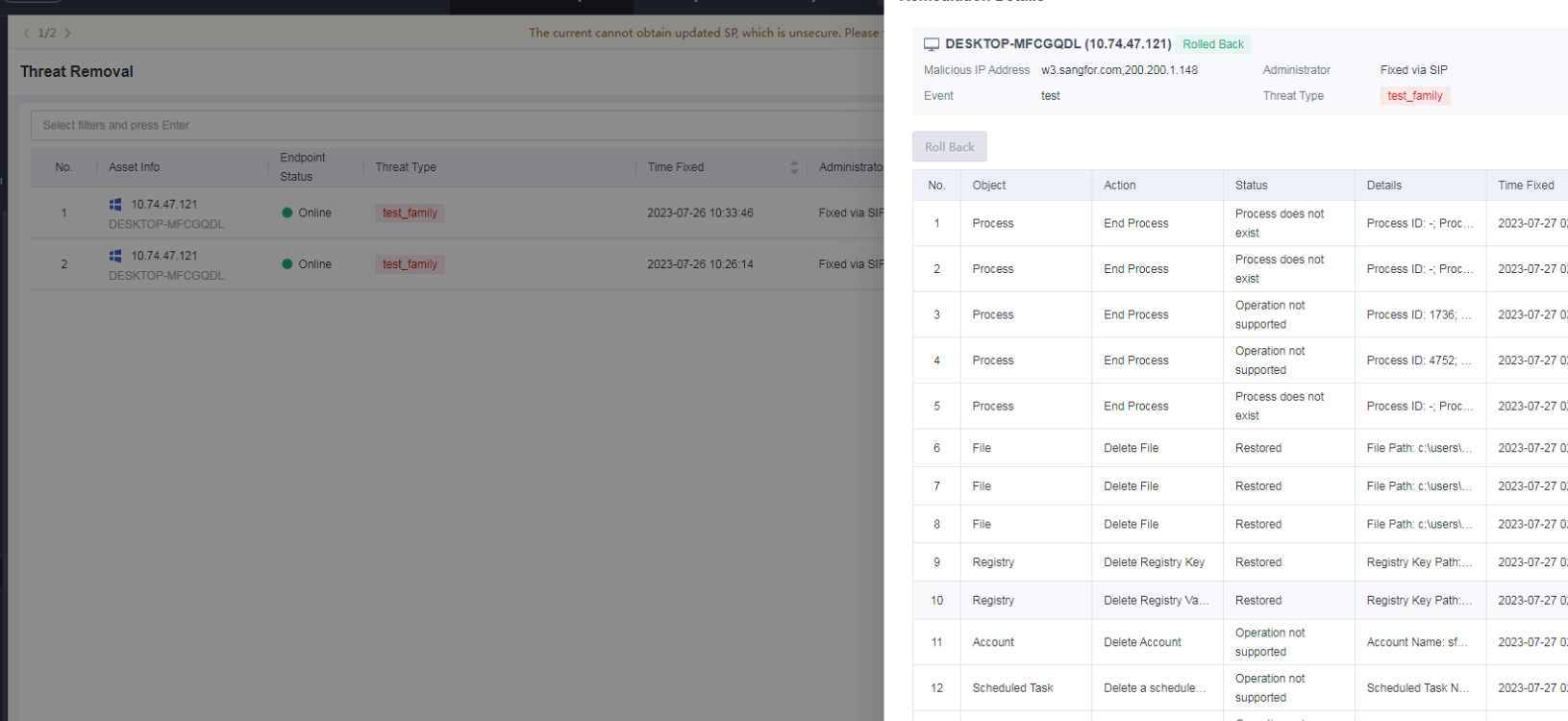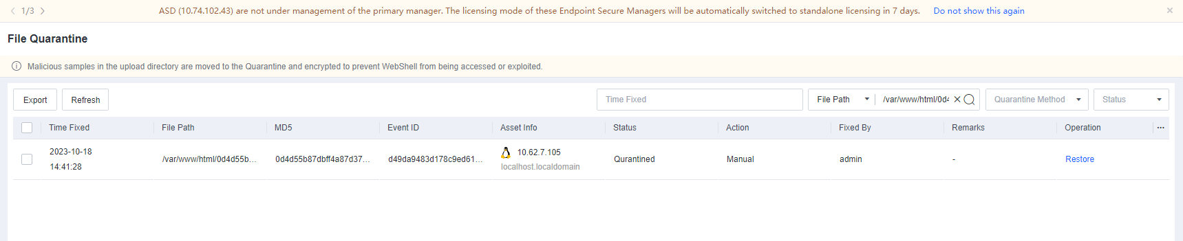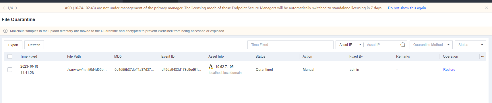 | Detection and Response | Response | File Quarantine | File quarantine | A file is quarantined. Your business may be affected if the file is required for a service. | High | Go to Detection and Response > Response > File Quarantine, and remove the file from the Quarantine area. You can also perform file restoration on an integrated device. |
