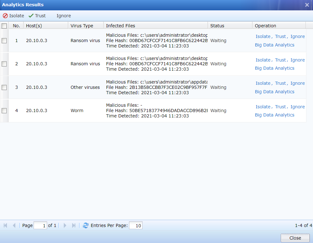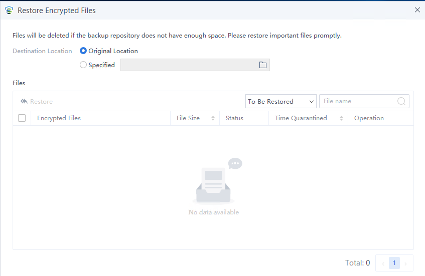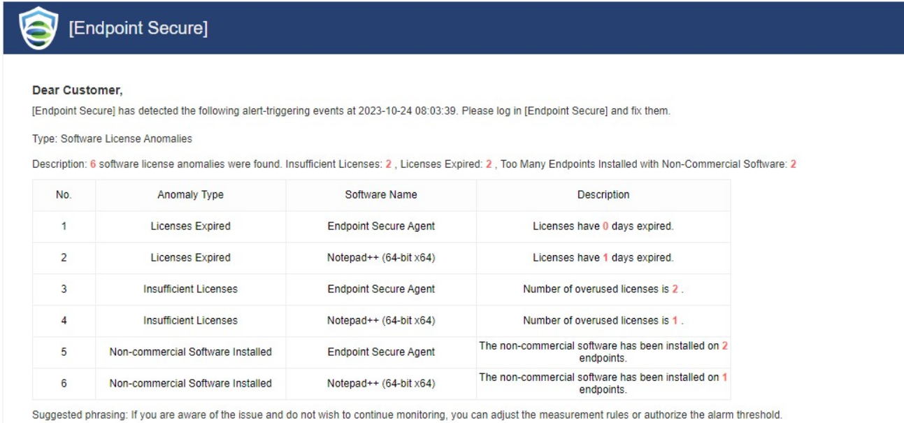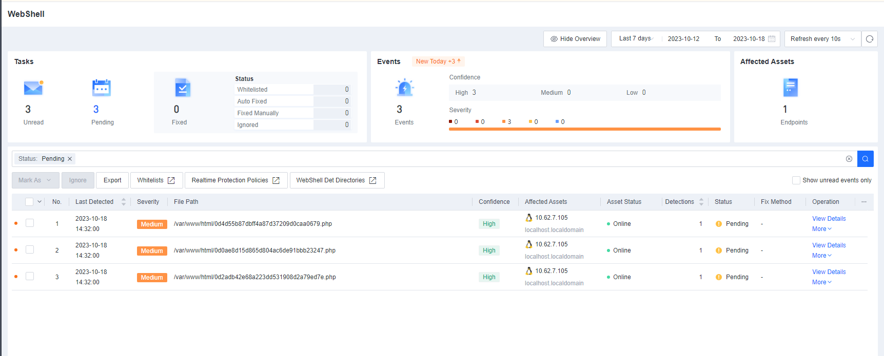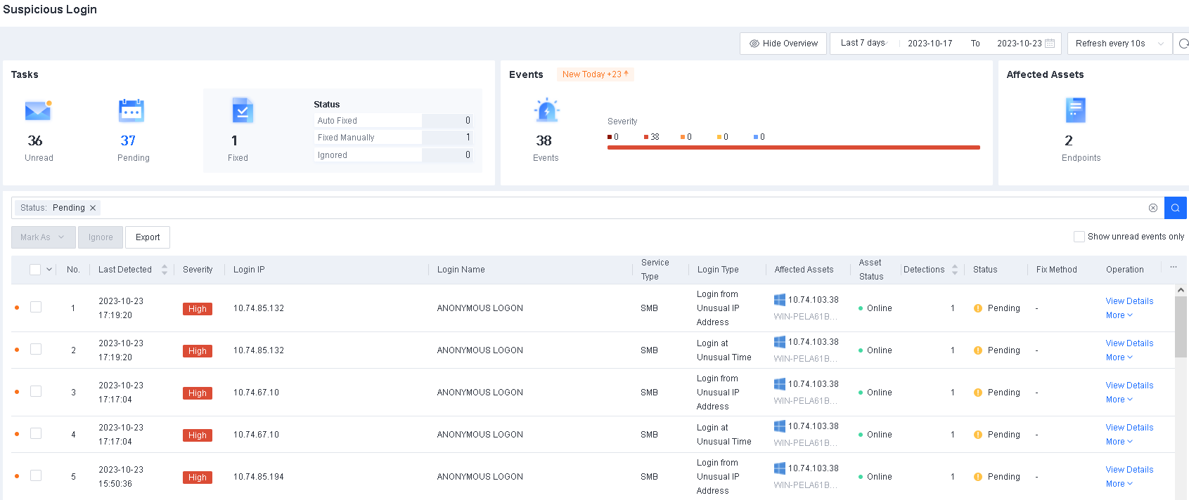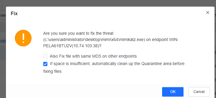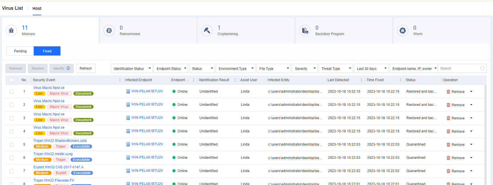 | Detection and Response | Response | File Quarantine | File quarantine | A file is quarantined. Your business may be affected if the file is required for a service. | High | Go to Detection and Response > Response > File Quarantine, and remove the file from the Quarantine area. You can also perform file restoration on an integrated device. |