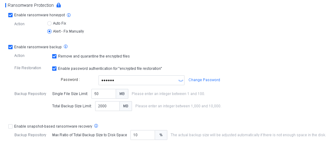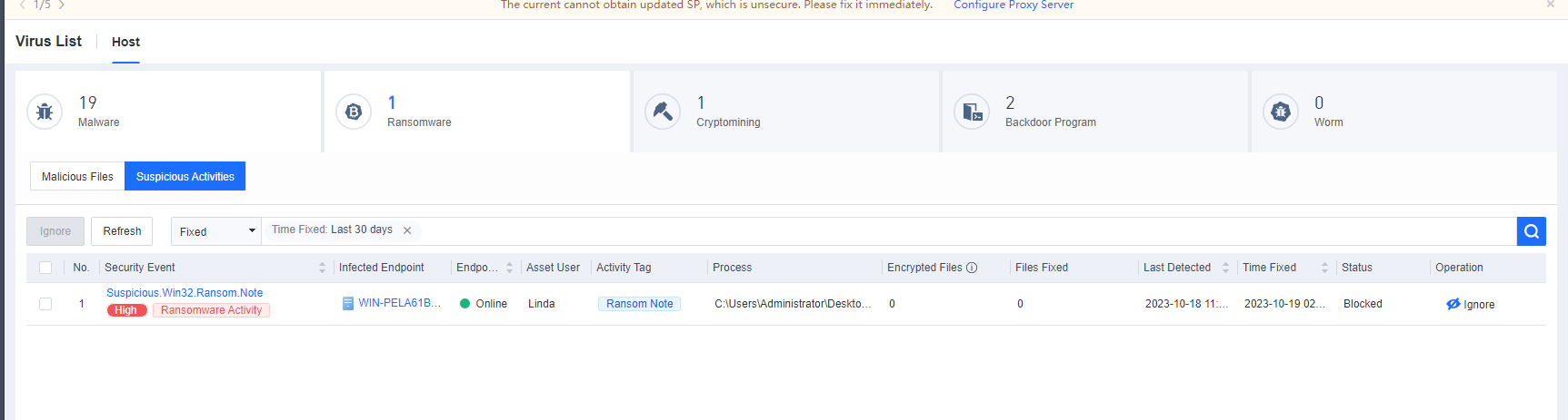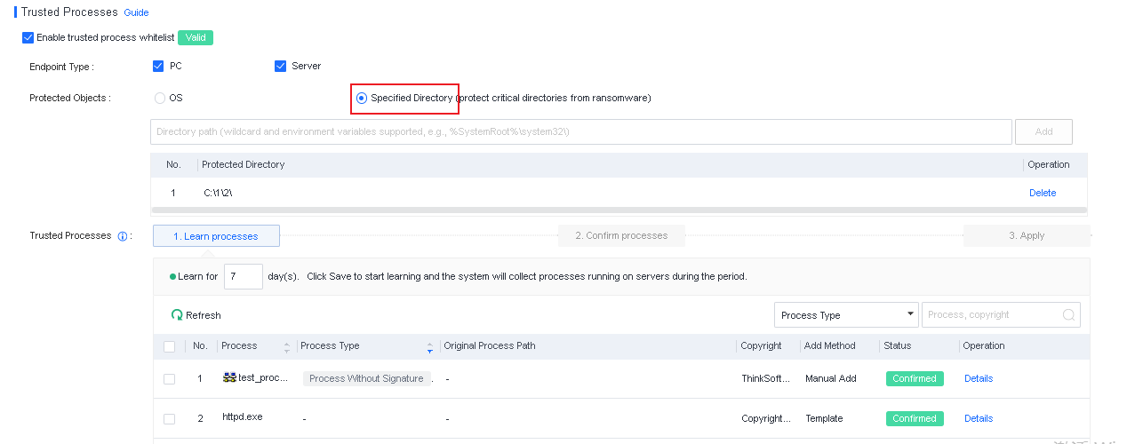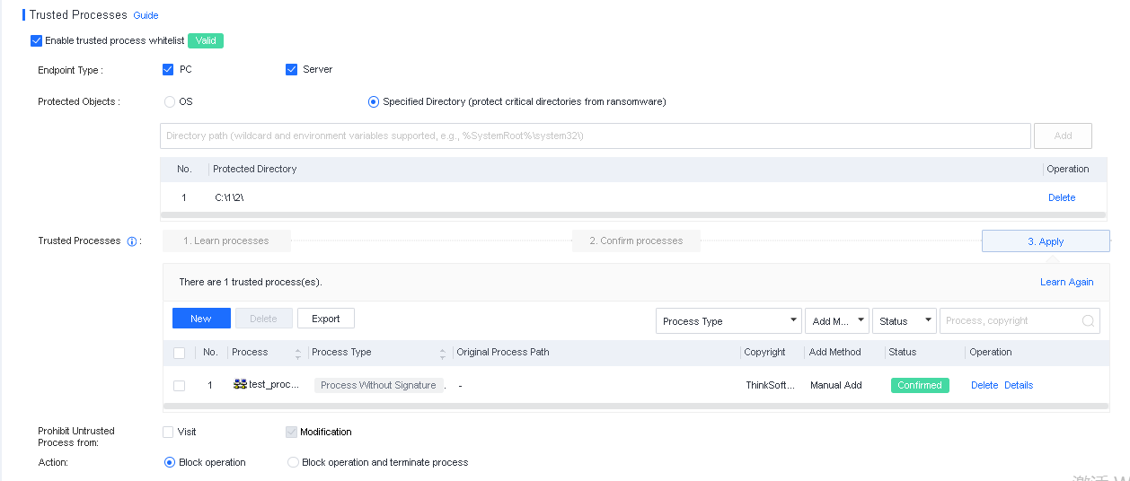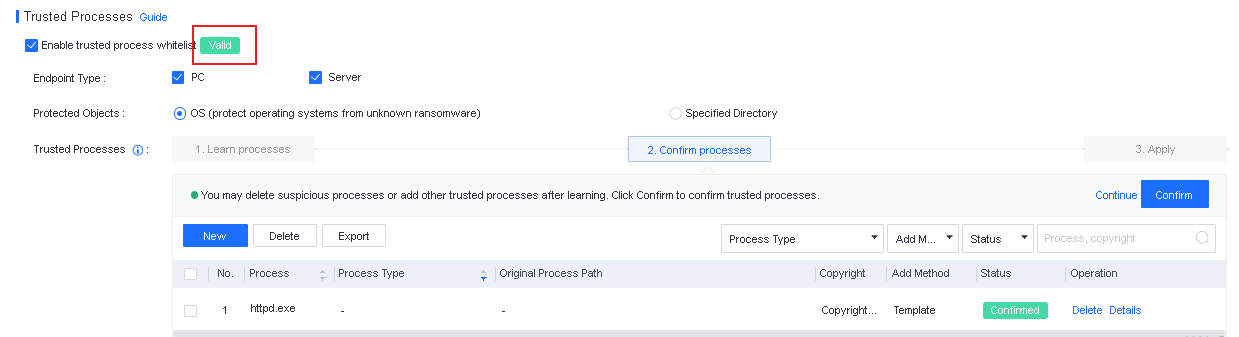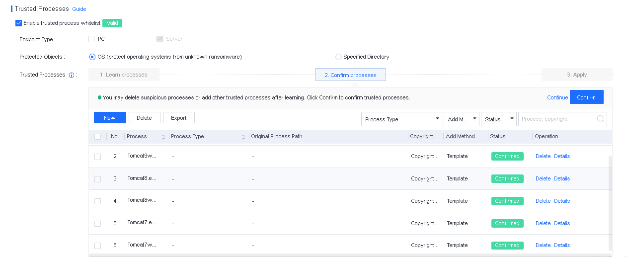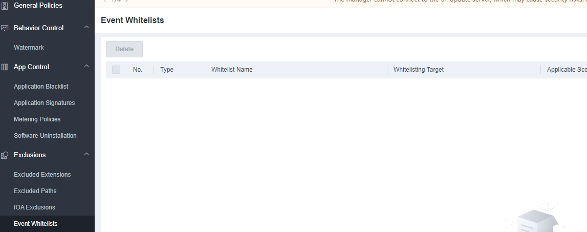 | Policies | General Policies | Anti-Ransomware | You have enabled the trusted process whitelist, but have not added server service processes to the whitelist. | Key server services cannot run, resulting in business interruption. | High | Add server service processes to the whitelist. |