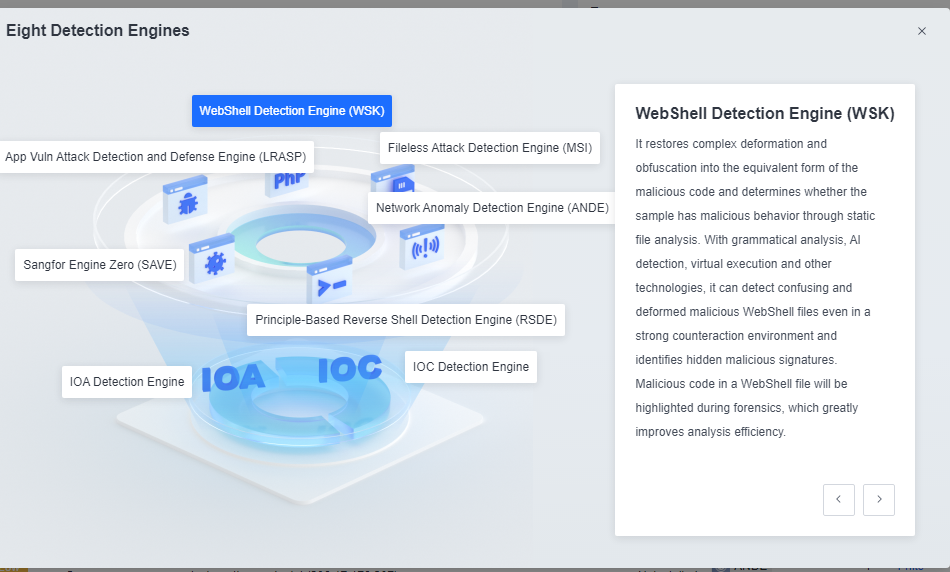 Detection: Provides threat detection capabilities, including funnel-style detection, AI-powered Sangfor Engine Zero, ransomware defense, advanced threat prevention, application behavioral profiling, and abnormal behavior identification.