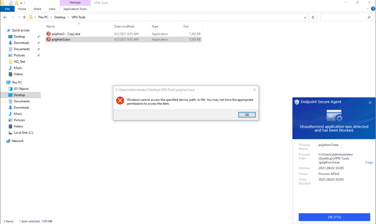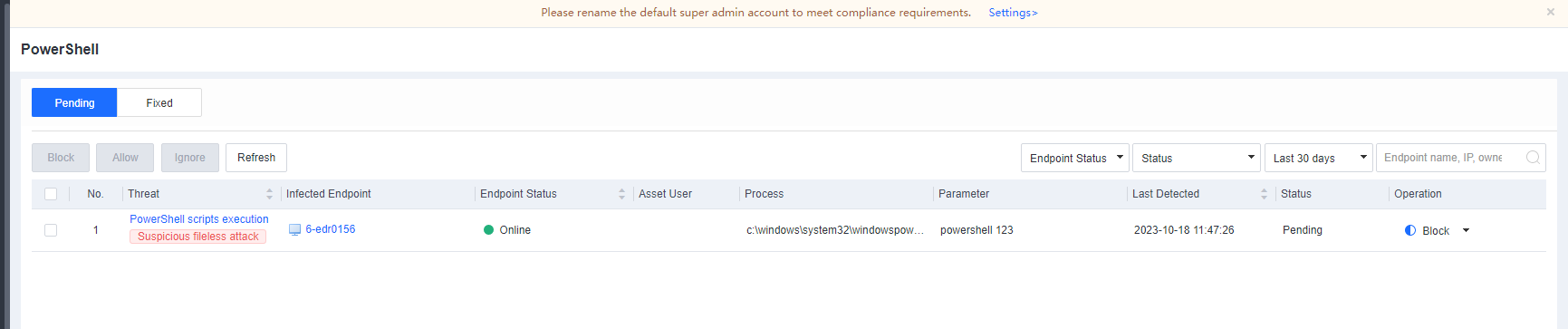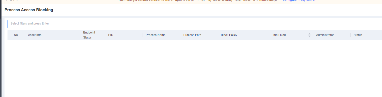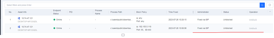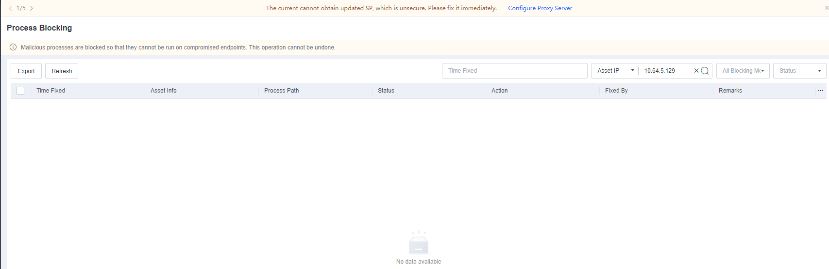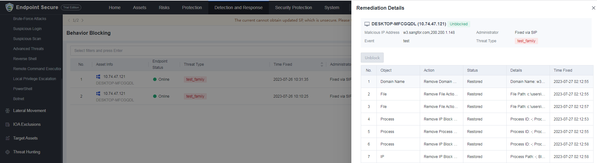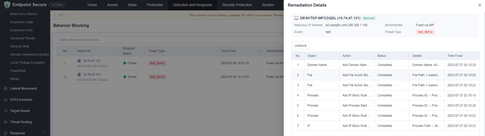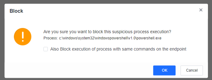 | Detection and Response | Response | Process Blocking | Process blocking | A process blocked on an endpoint is killed. Your business may be affected if the process is required for a service. | High | Restart the process on the endpoint. |