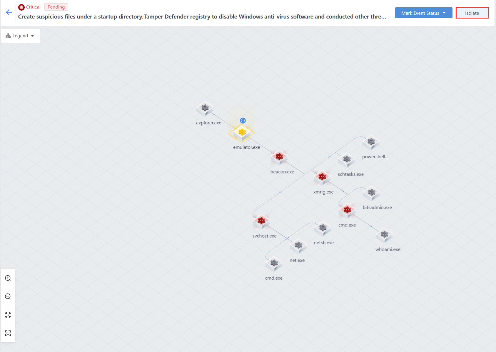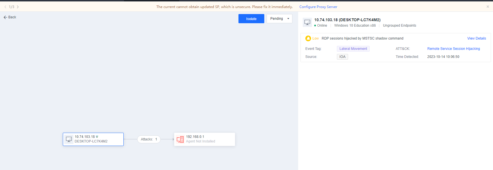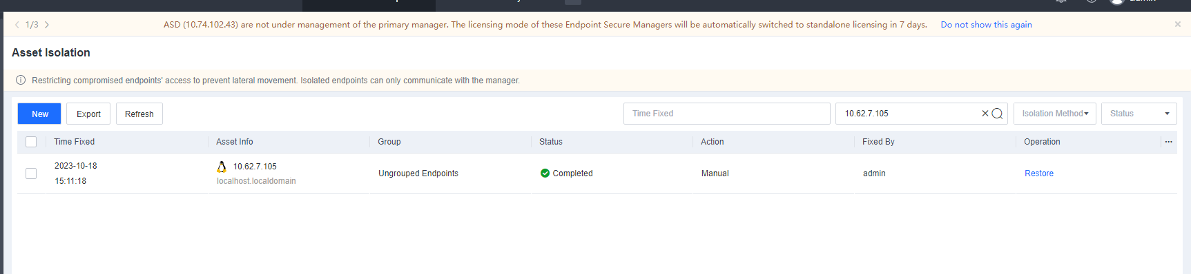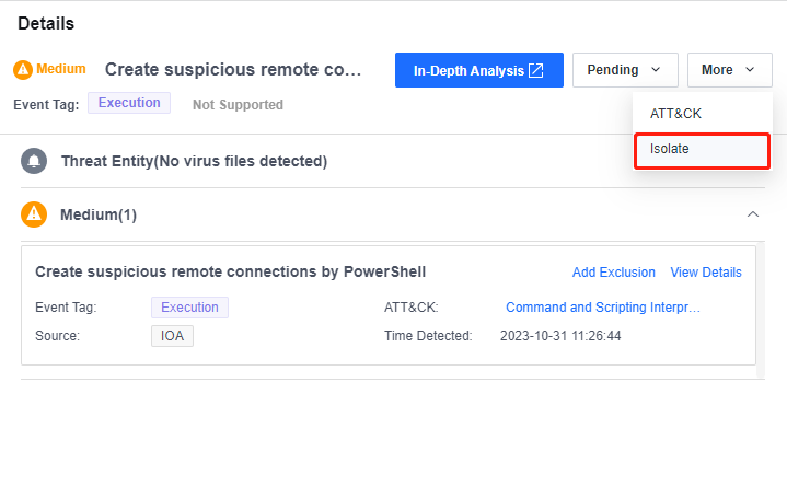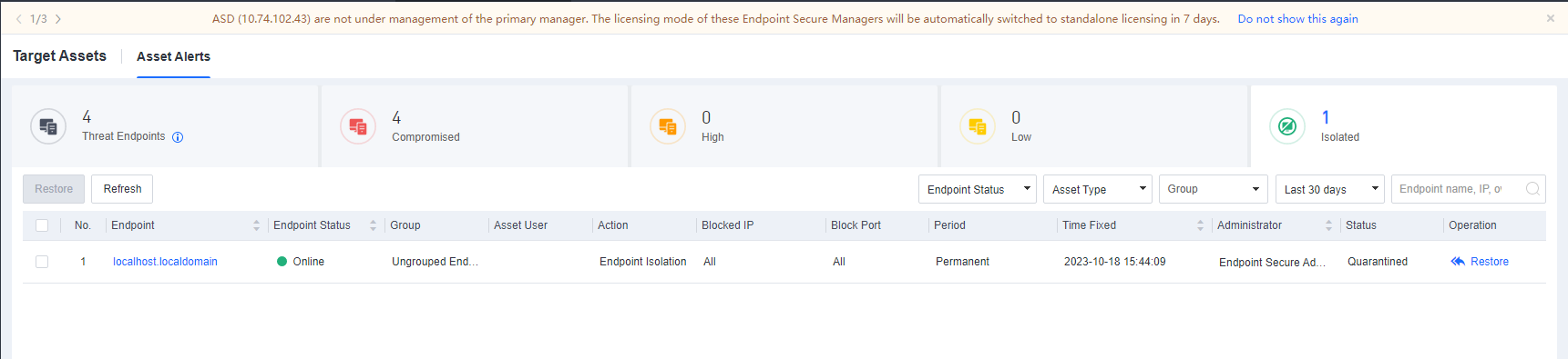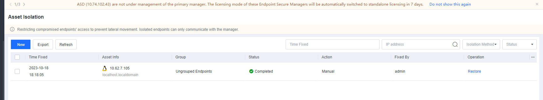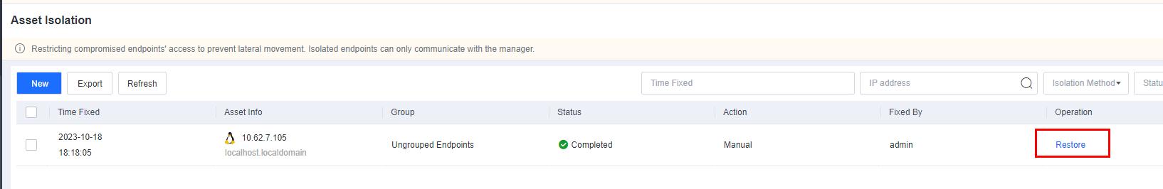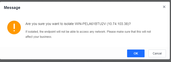 | Detection and Response | Response | Asset Isolation | Isolation | An isolated endpoint cannot access any other networks. If a server is isolated, your business may be affected. | High | Go to Detection and Response > Response > Asset Isolation, and remove the asset from isolation. |