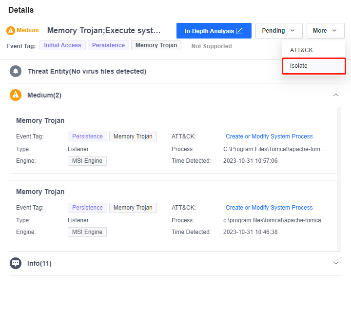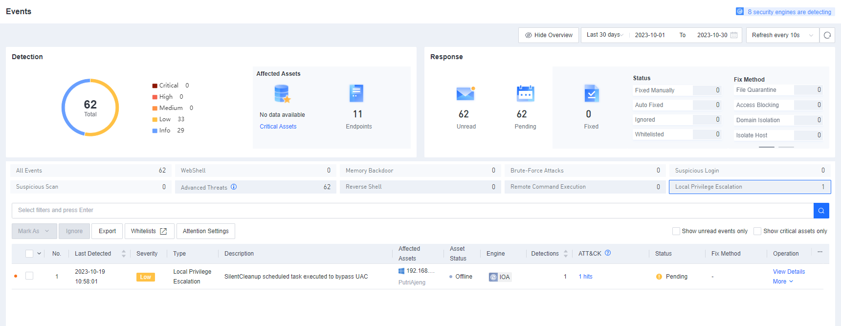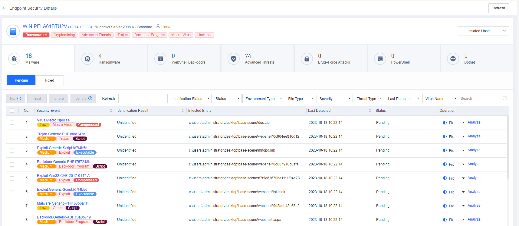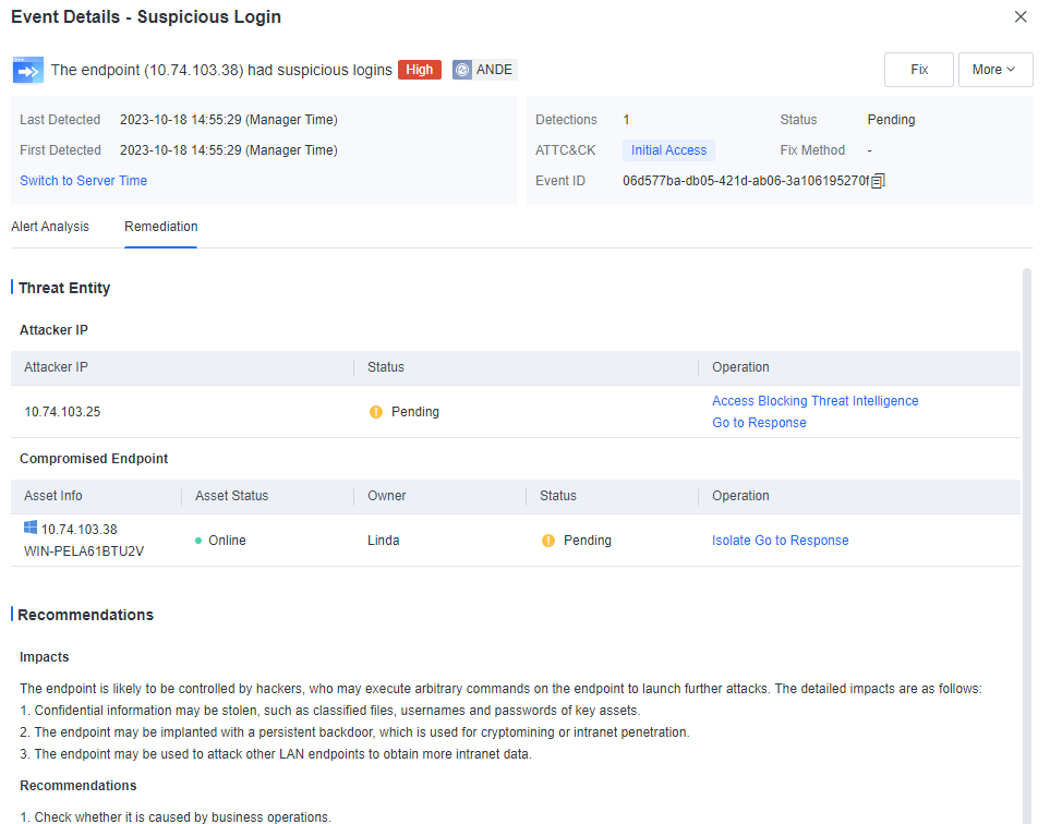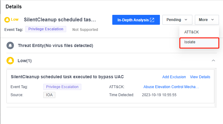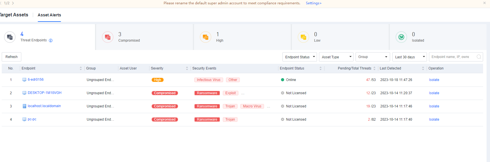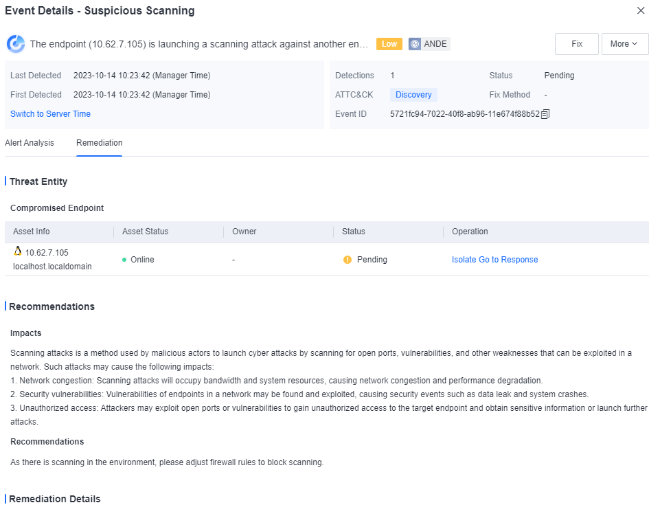 | Detection and Response | Response | Asset Isolation | Isolation | An isolated endpoint cannot access any other networks. If a server is isolated, your business may be affected. | High | Go to Detection and Response > Response > Asset Isolation, and remove the asset from isolation. |