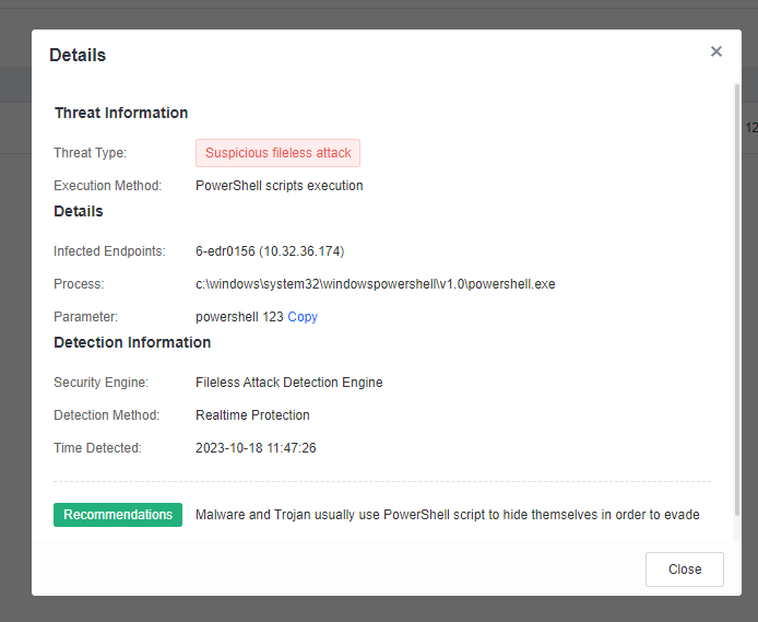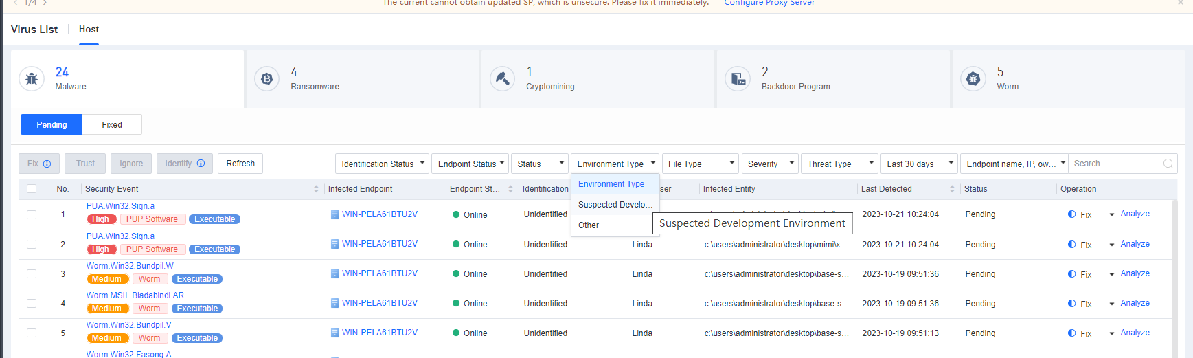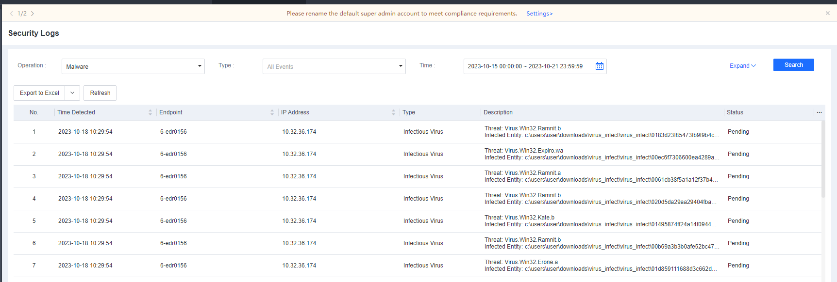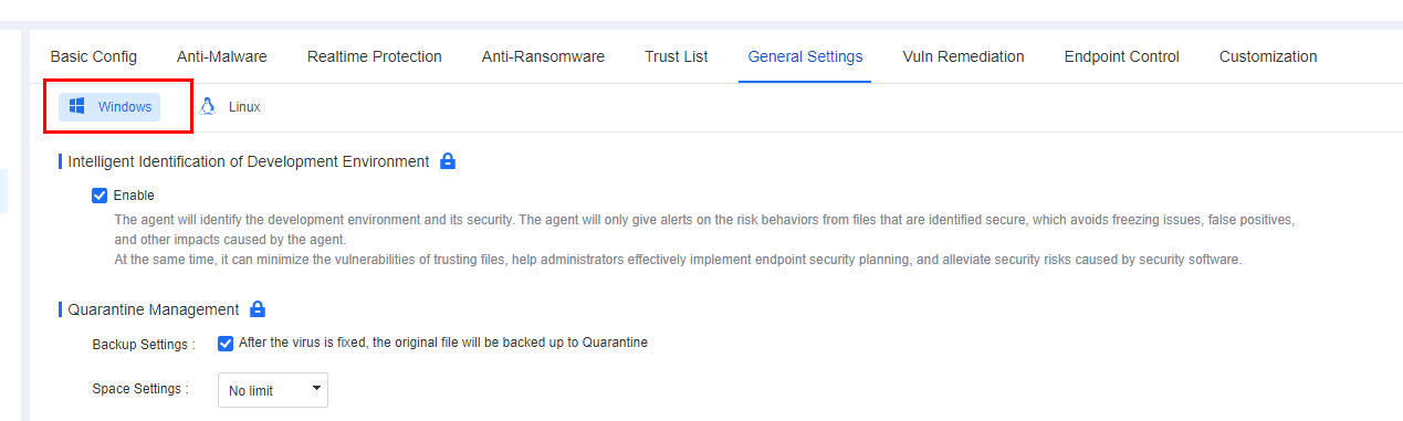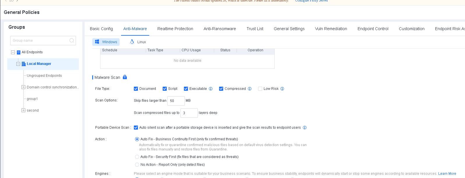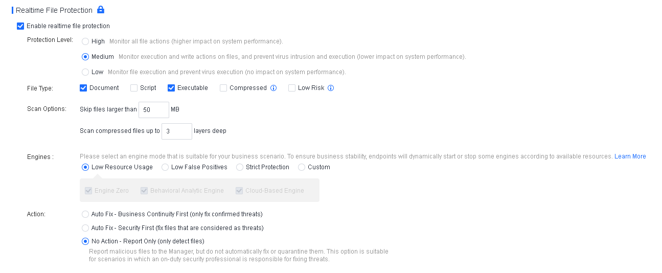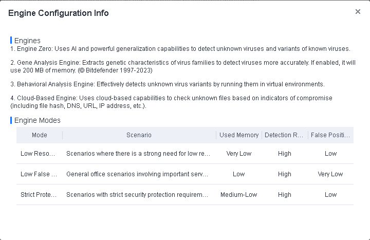 | Policies | General Policies | Anti-Malware | The engine is set to High Detection Rate for daily operations. | The virus detection rate is higher in High Detection Rate mode, resulting in more false positives. We recommend using this mode only when you test the virus detection rate. | High | Do not set the engine to High Detection Rate for daily operations. |