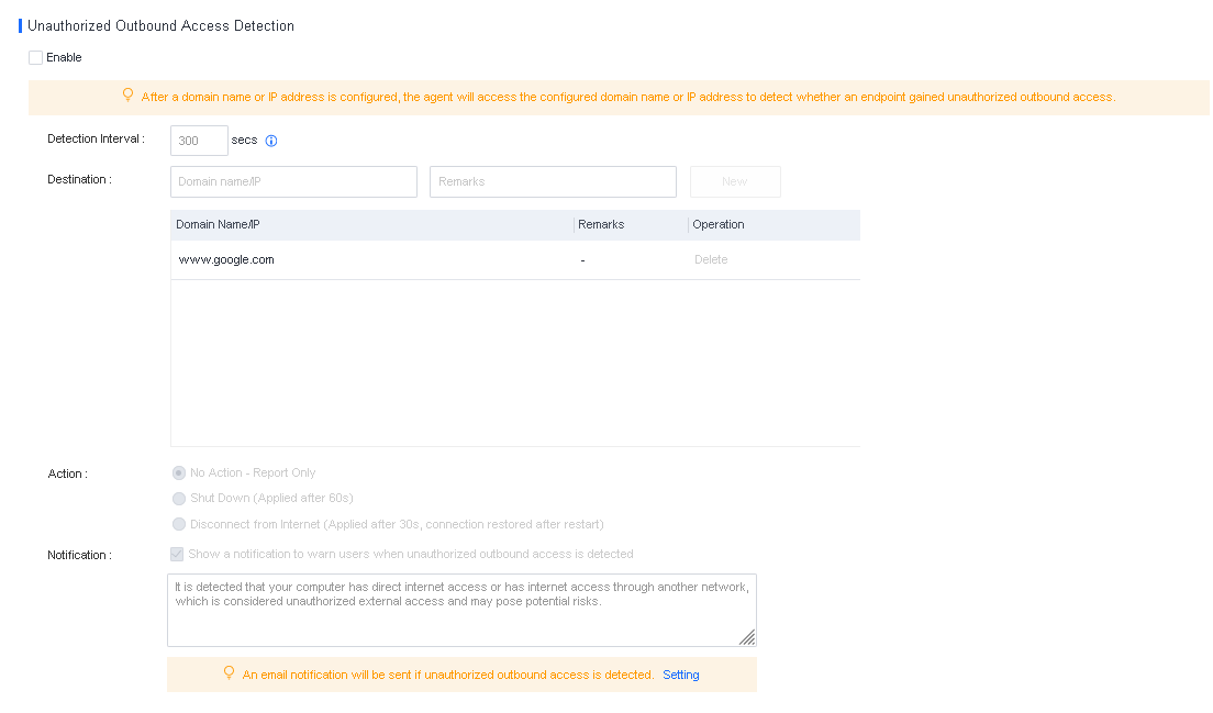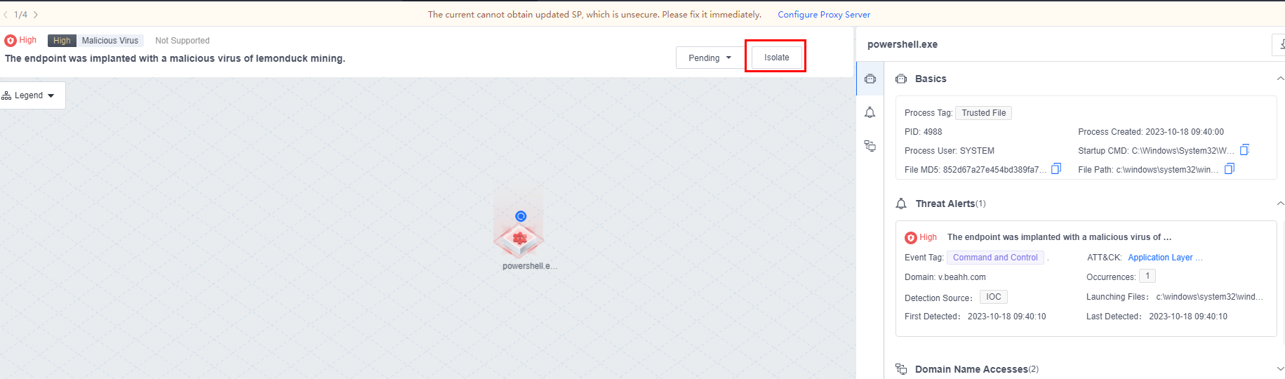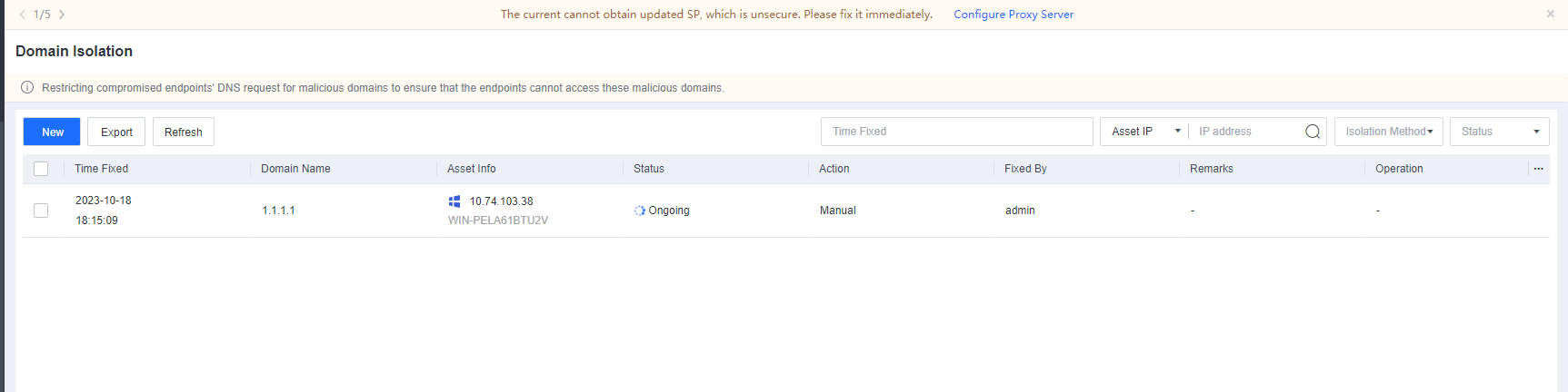 | Detection and Response | Response | Domain Isolation | Domain name and IP address isolation | An isolated domain name or IP address is not accessible to endpoints. Your business may be affected if an isolated domain or IP address is required for a service. | High | Go to Detection and Response > Response > Domain Isolation, and remove the domain name or IP address from isolation. |