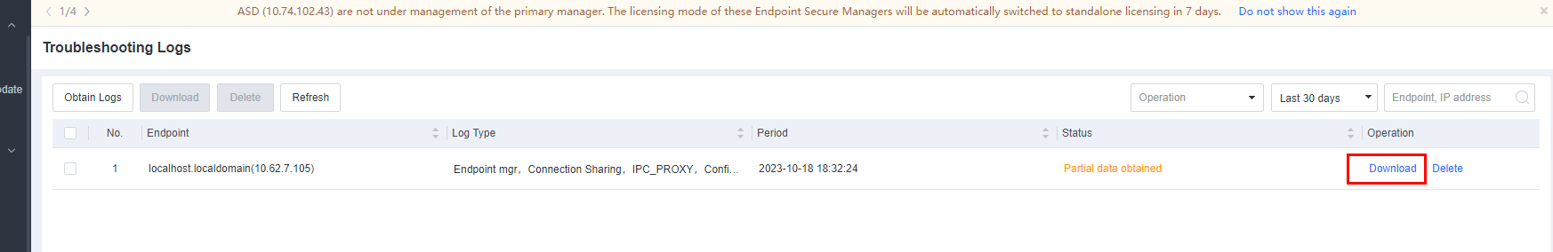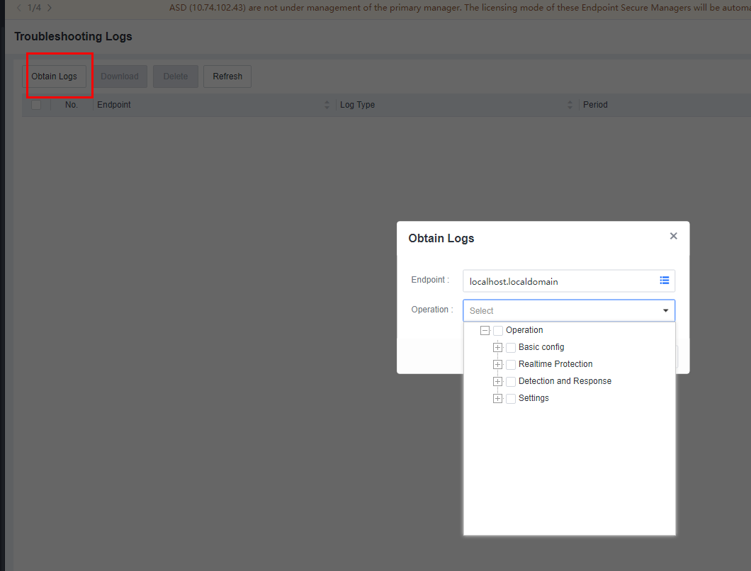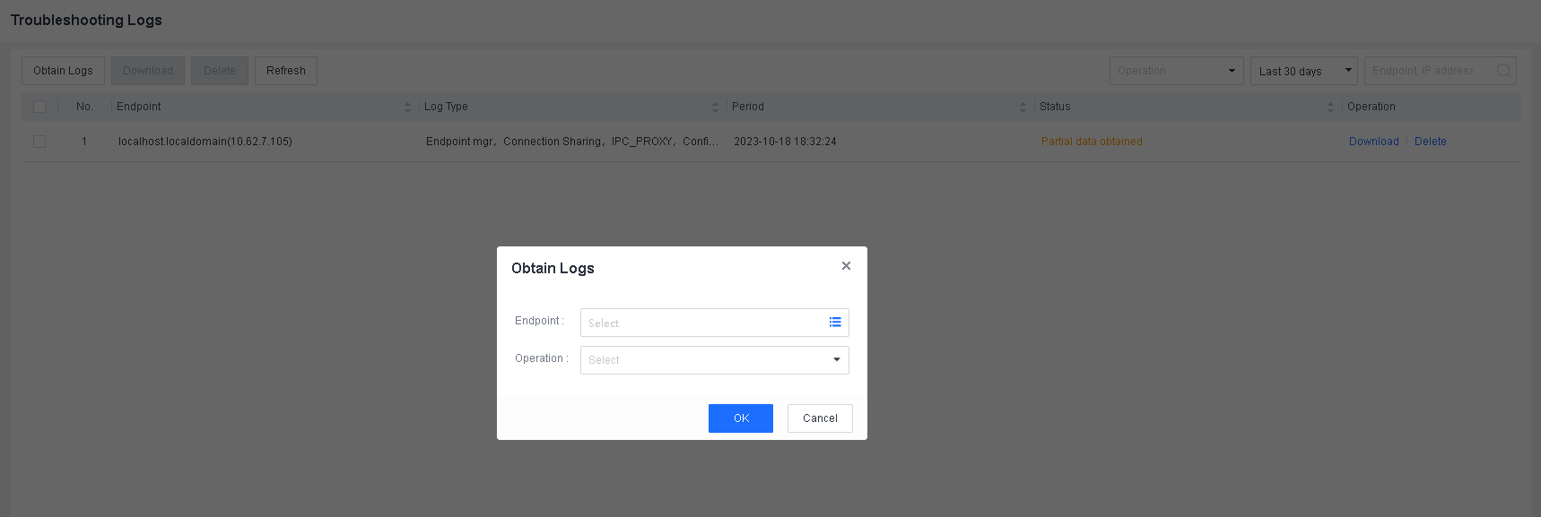 Click Obtain Logs and specify the endpoints and log types, as shown in the following figure.