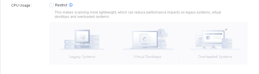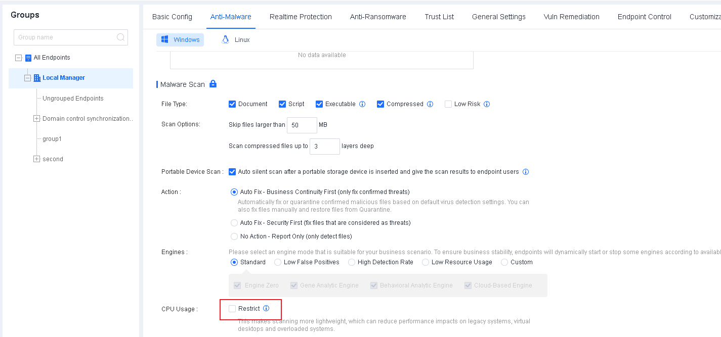 Log in to Endpoint Secure Manager. Go to Policies > Anti-Malware and select Restrict for CPU Usage, as shown in the following figure.