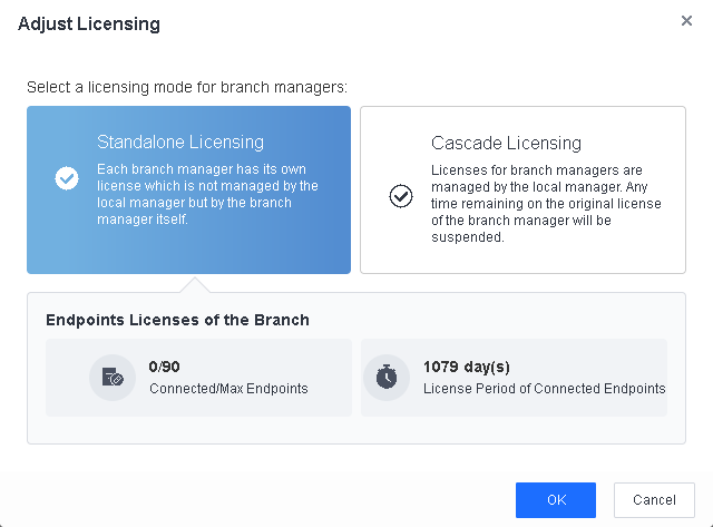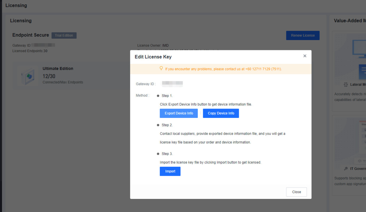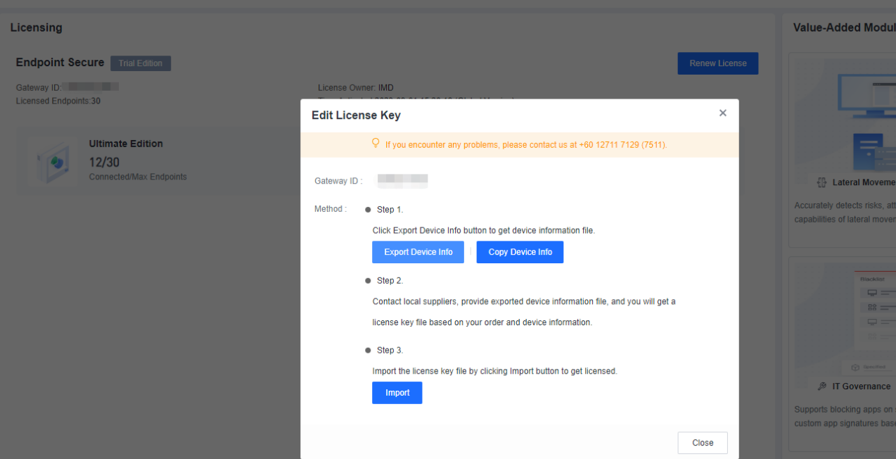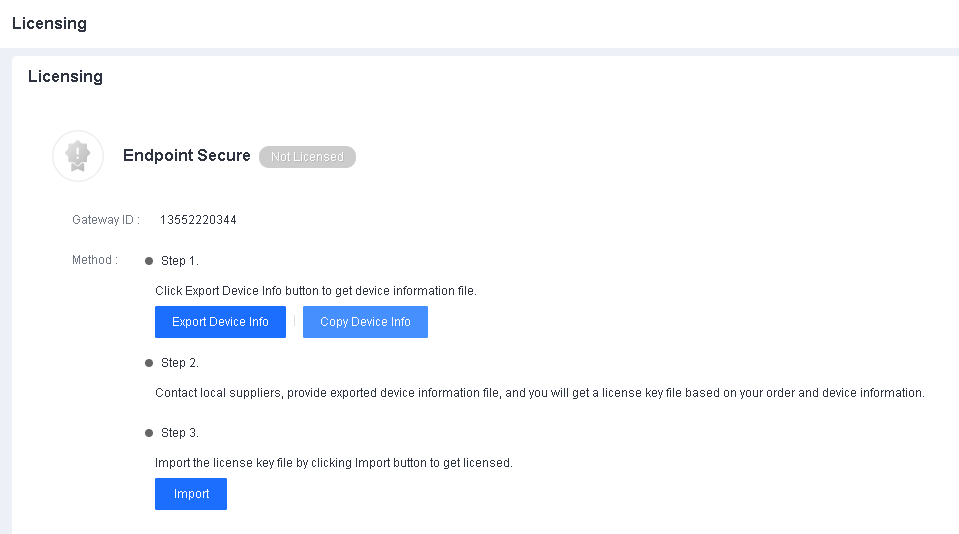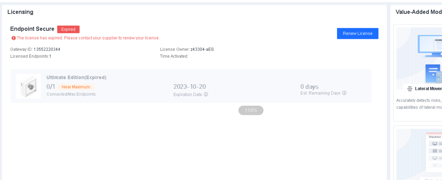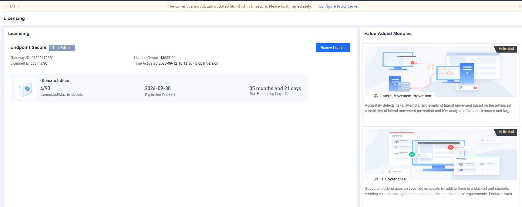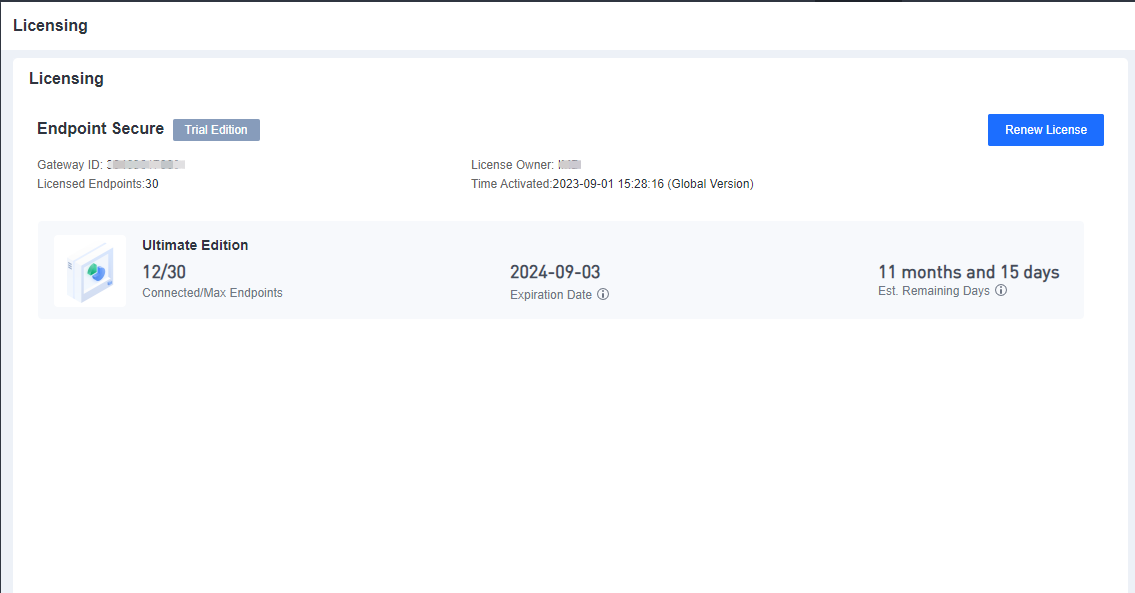 Go to System > Licensing and check whether the license is valid, as shown in the following figure. If the license has expired, Endpoint Secure cannot be upgraded.
