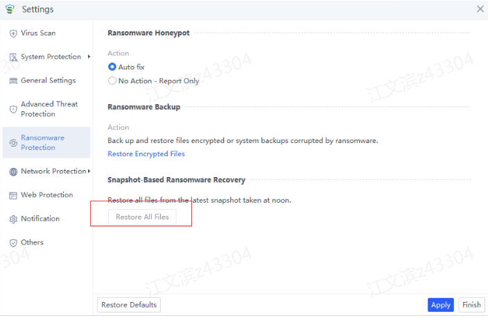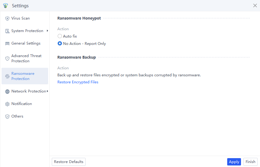 | Policies | General Policies | Realtime Protection | In the Realtime File Protection section, the action to take for a detected threat file is set to Auto Fix – Security First. | A business file may be quarantined due to a false positive, which can cause a system error. | High | Set the action for a detected threat file to Auto Fix – Business Continuity First. |