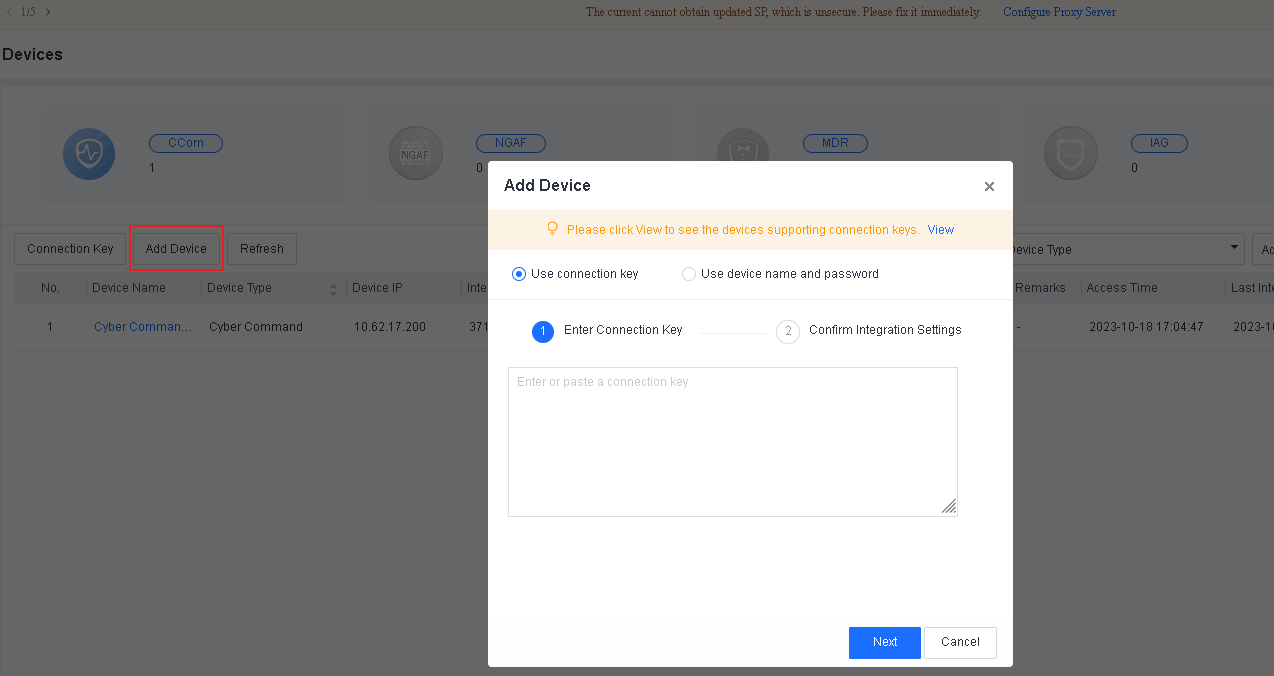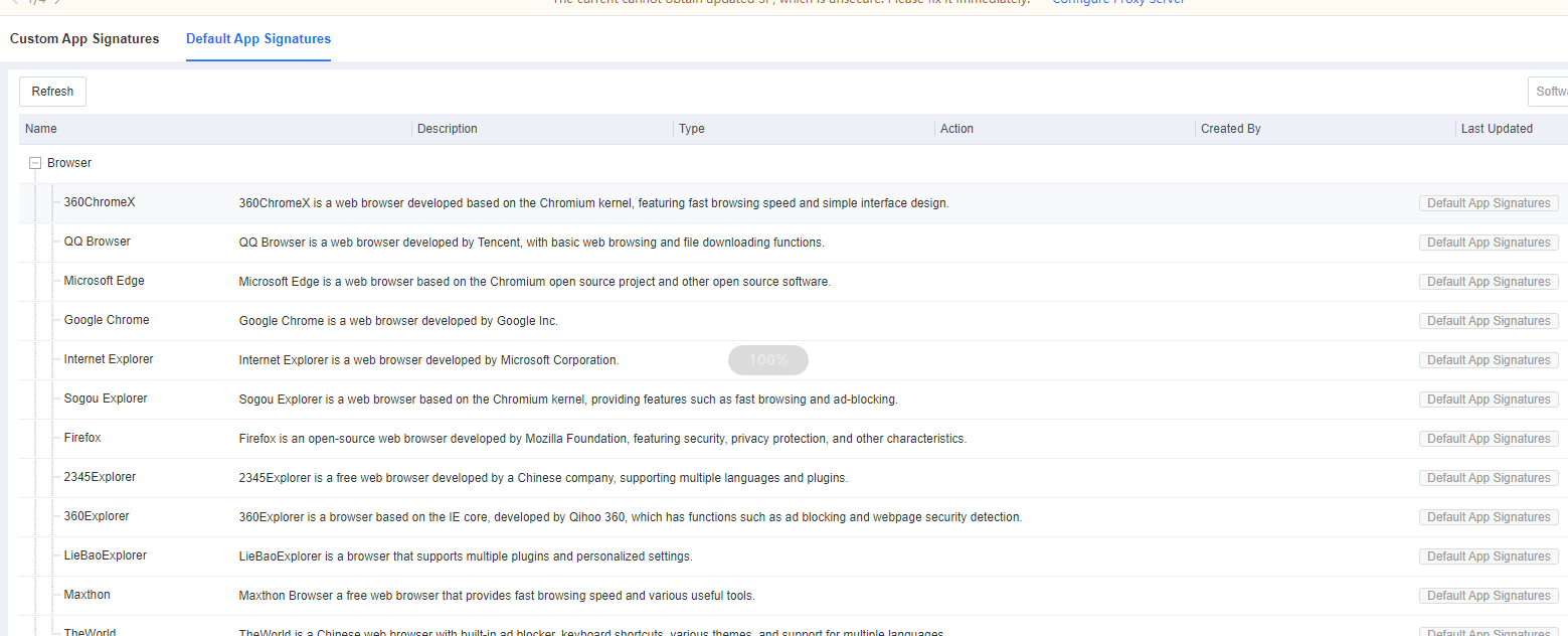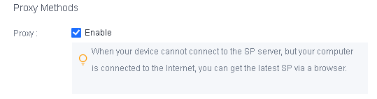 If Endpoint Secure Manager cannot directly connect to the Internet, but the local computer has Internet access, you can enable a browser proxy, so that Endpoint Secure Manager obtains service pack updates through the proxy, as shown in the following figure.