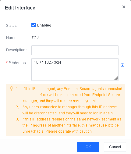 On the System > System > Network > Interfaces tab, specify the IP address configured for the management interface of Endpoint Secure Manager, as shown in the following figure.