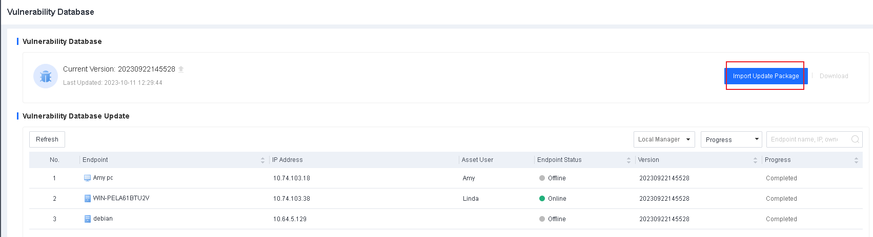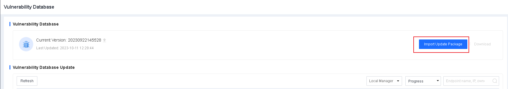Log in to Endpoint Secure Manager. Go to System > System Updates > Vulnerability Database, and click Import Update Package. Then, select the database downloaded in Step 1. After the database is imported to Endpoint Secure Manager, Endpoint Secure Agent will automatically update the database, as shown in the following figure.