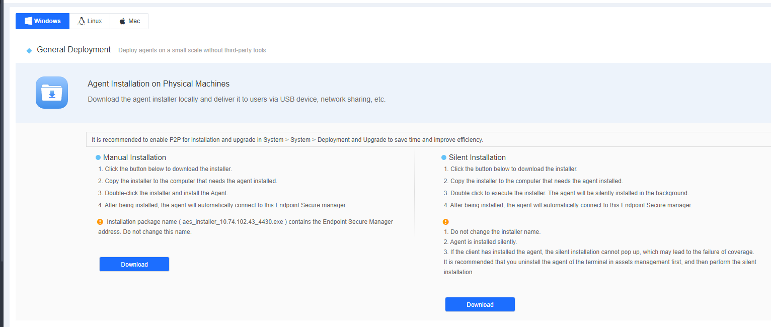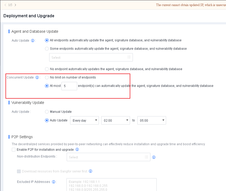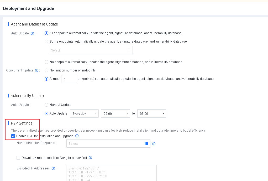 - P2P upgrade is supported for Endpoint Secure Agent installation, Endpoint Secure Agent upgrade, and antivirus database update.