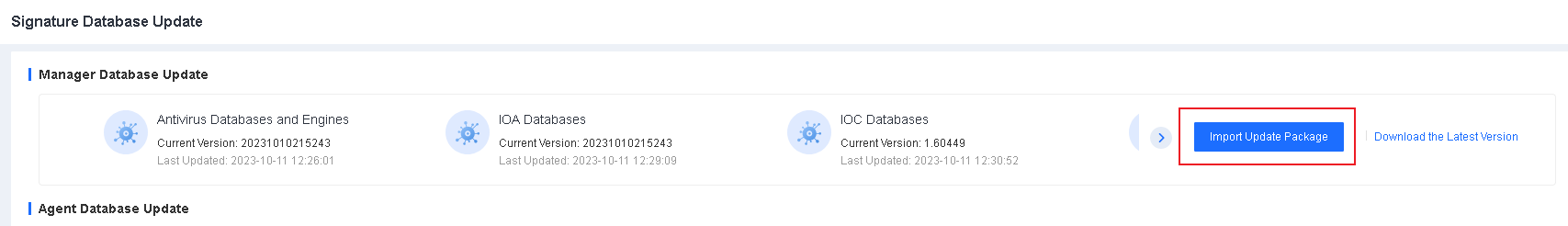 Log in to Endpoint Secure Manager. Go to System > System Updates > Signature Database Update, and click Import Update Package. Then, select the antivirus database downloaded in Step 1. After the antivirus database and engine are imported to Endpoint Secure Manager, Endpoint Secure Agent will automatically update the antivirus database and engine, as shown in the following figure.