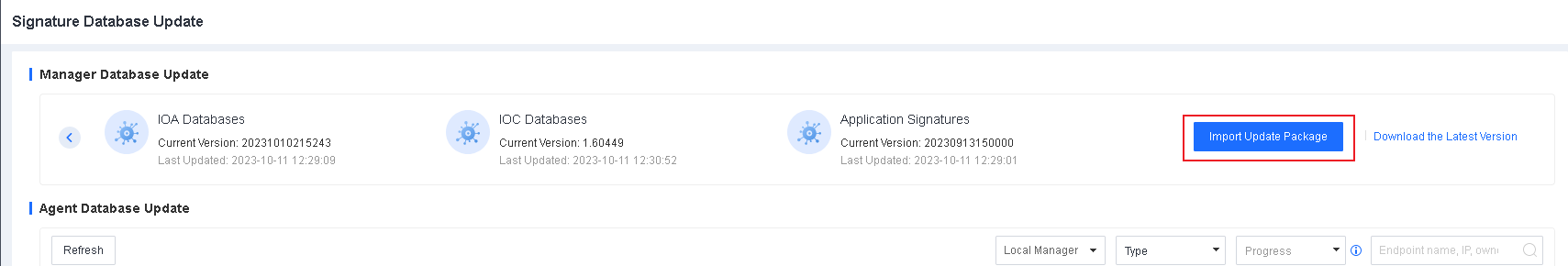 Log in to Endpoint Secure Manager. Go to System > System Updates > Signature Database Update, and click Import Update Package. Then, select the database downloaded in Step 1. After the IOA or IOC database is imported to Endpoint Secure Manager, Endpoint Secure Agent will automatically update the IOA or IOC database, as shown in the following figure.