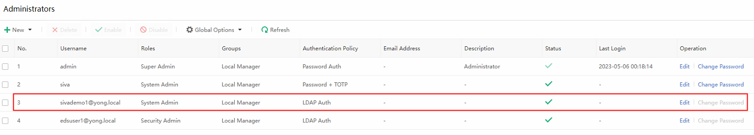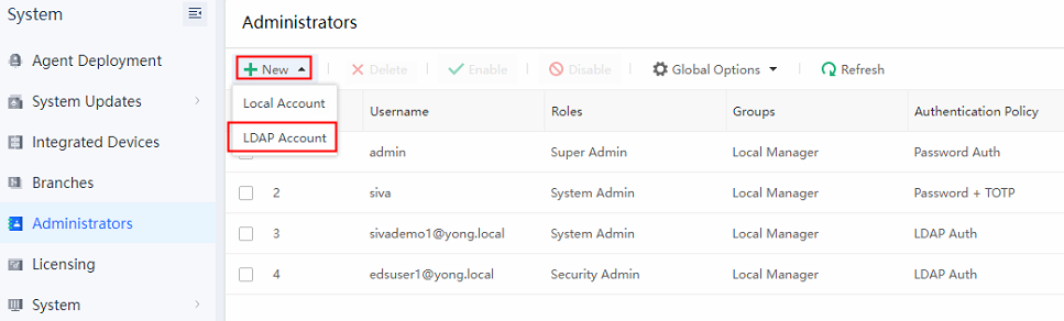 a) Add domain account. Navigate to System > Administrators, and click New > LDAP Account.