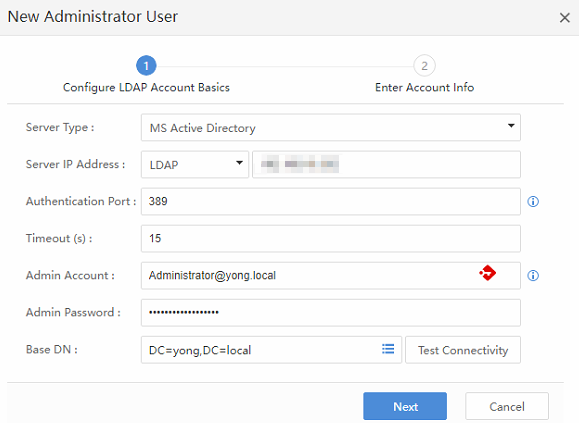 b) Fill in the LDAP and account information.