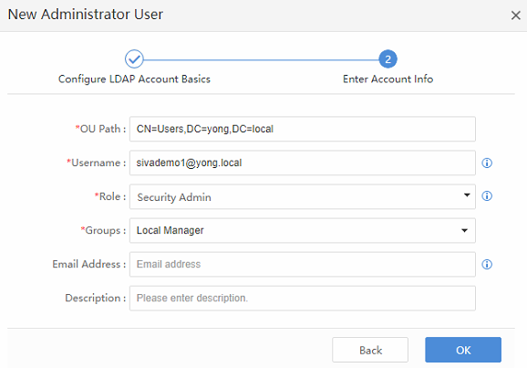 Users can synchronize LDAP domain accounts in the Administrator module, assign permissions to corresponding groups, and log in through domain accounts as security admin, system admin, and audit admin for corresponding groups.