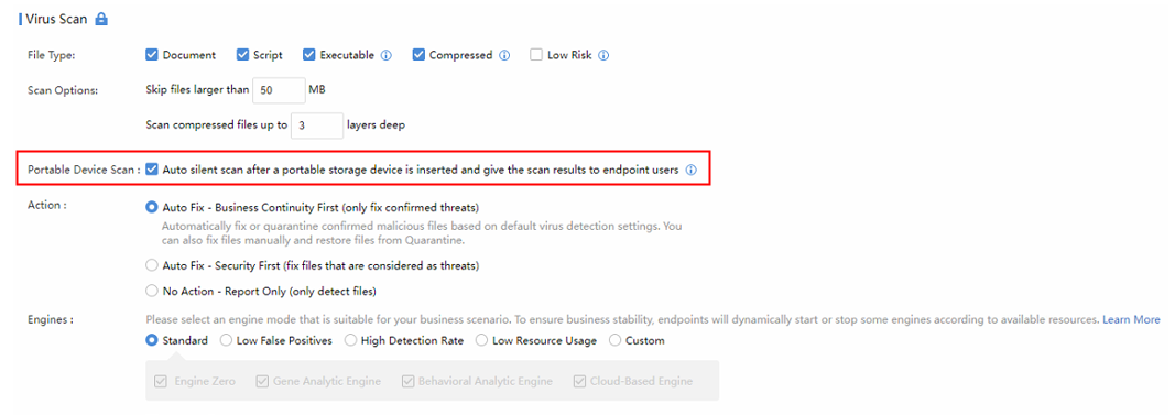 - The Portable Device Scan feature is added and automatically silently scans new USB devices connecting the endpoint.