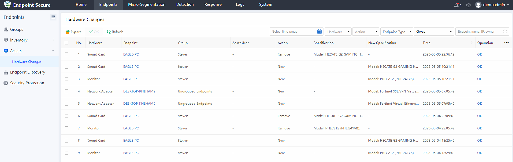 - Hardware Changes feature is added to audit abnormal hardware asset changes and has better control over the risks of hardware changes. Navigate to Endpoints > Assets > Hardware Changes to view the details.