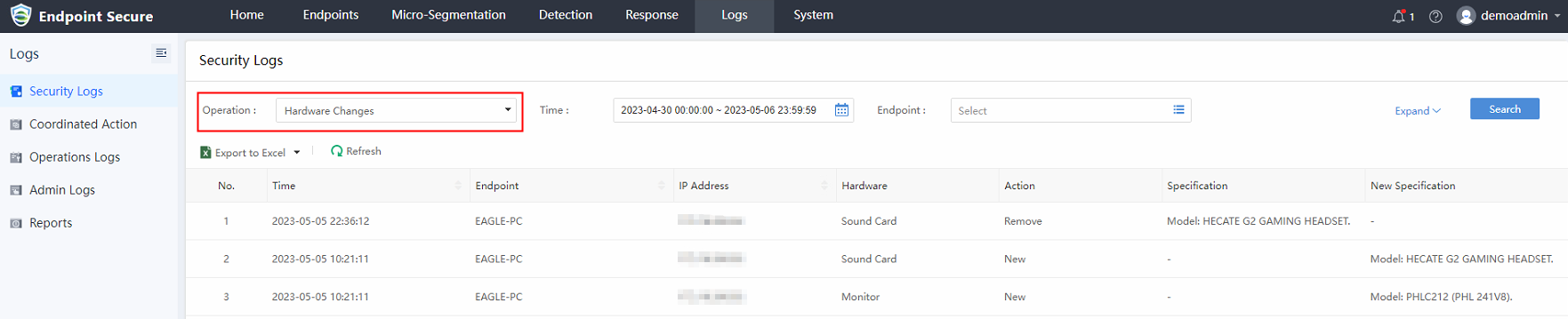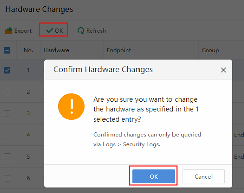 The administrator may also view the hardware changes logs under Logs > Security Logs and filter Hardware Changes in Operation.