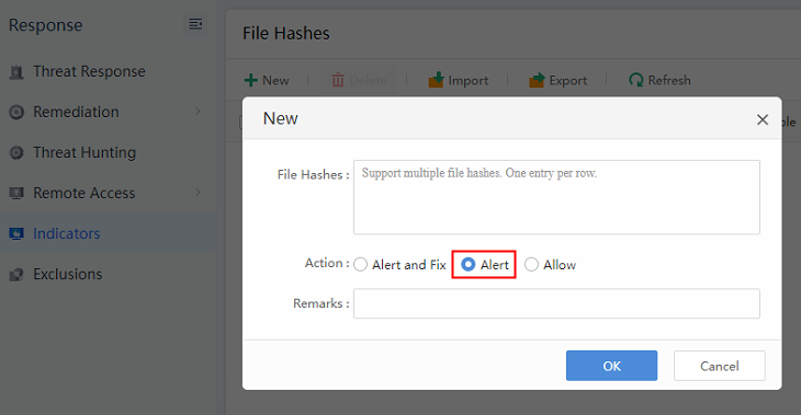 - File Hashes now also supports Alert only.
