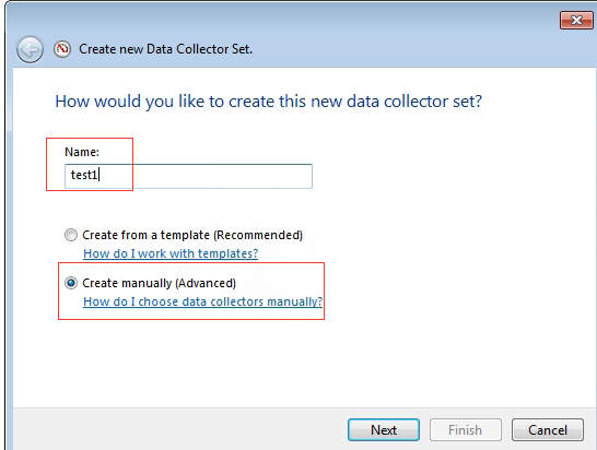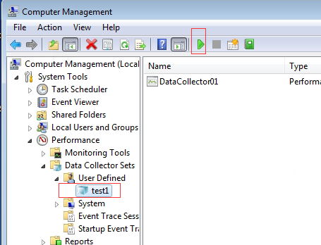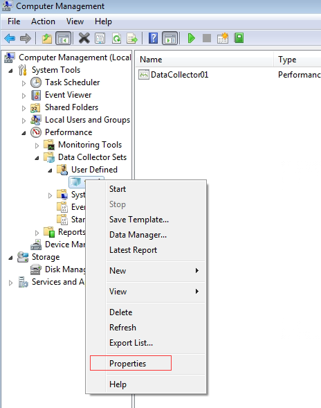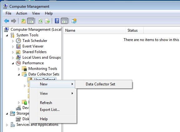 - Navigate to Computer Management > System Tools > Performance > Data Collector Sets > User Defined, right-click, and select New > Data Collector Set.