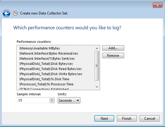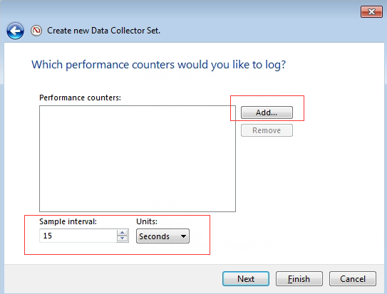 - Adjust the collection Sample interval, and click Add to add a performance counter.