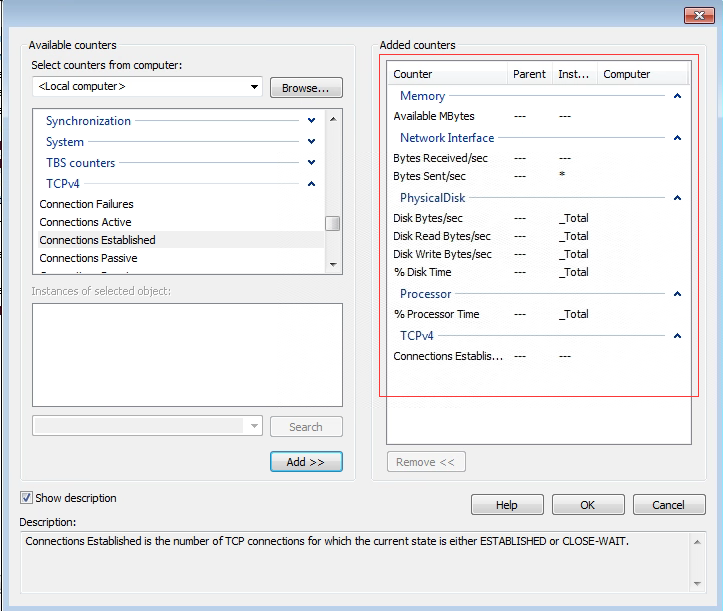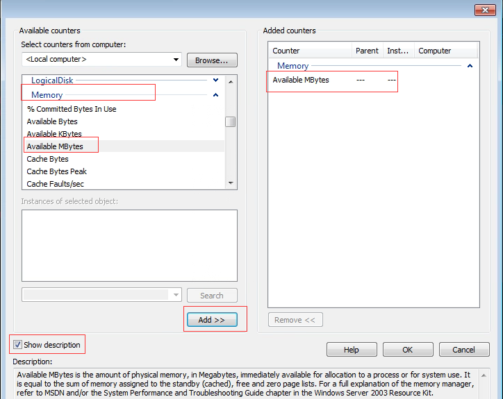 - Add the performance counters to be collected. Firstly, check the Show Description checkbox to see the description of the selected indicator; Secondly, select the indicator item to be added. For example, find the Memory item, then looks for the Available Mbytes (the description of the indicator can be found in the Description section at the bottom). Next, click the Add button to add the Available Mbytes counter to the counter list on the right; Finally, click OK after all counters are selected.