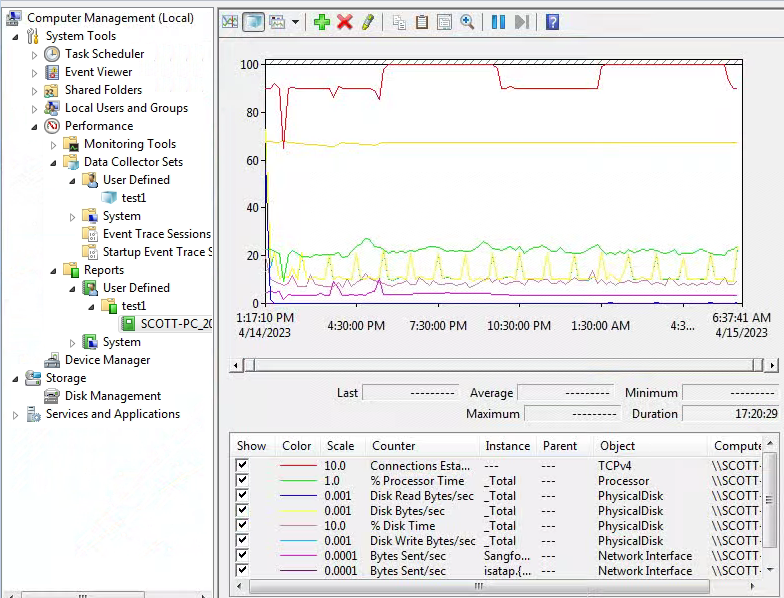 - To find the report, navigate to Computer Management > System Tools > Performance > Reports > User Defined. You can see the maximum value, minimum value, and average value of each performance counter and a line graph of each indicator.