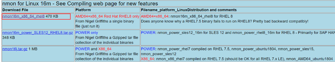 When downloading the nmon software package, you must select the correct platform architecture. Currently, all X86-64bit Linux servers are running on hyper-converged systems. However, there may not be an exact matching version. Therefore, you can download the same architecture, adjacent version, or operating system of the same source.