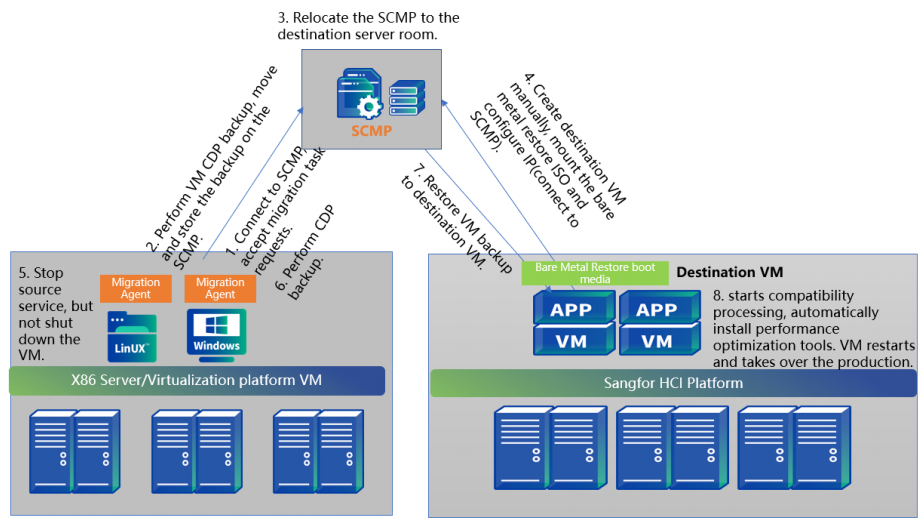| Migration environment preparation | Migration Destination | Sangfor | 5 mins per physical host | Add the HCI cluster as a virtual management center, or deploy recovery boot media for virtual machines. |