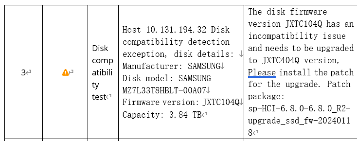 After the Health Check, download the report. If the report shows the warning about disk compatibility (disk model mentioned in Chapter 1), it indicates that the current cluster is at risk for this SSD issue, as shown below.