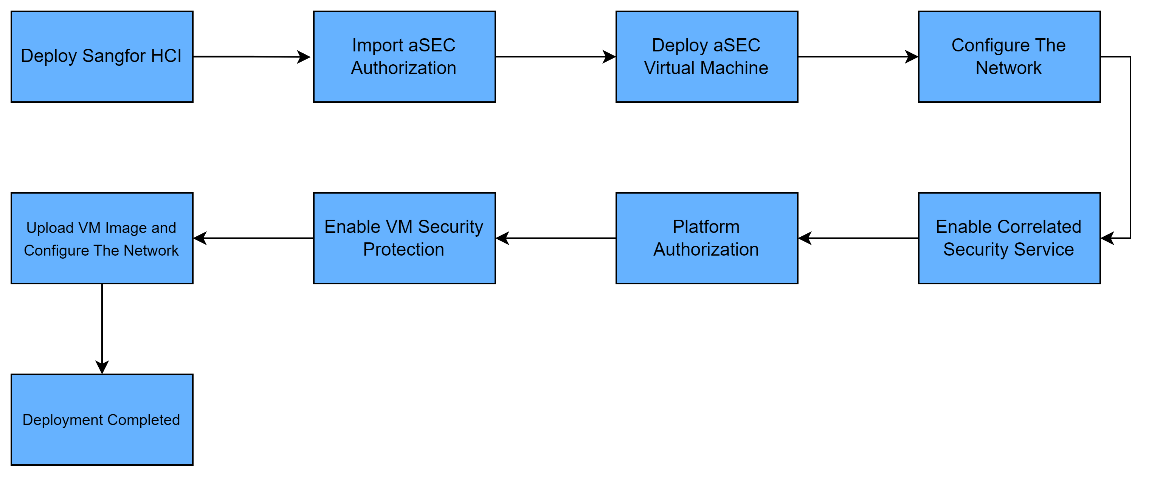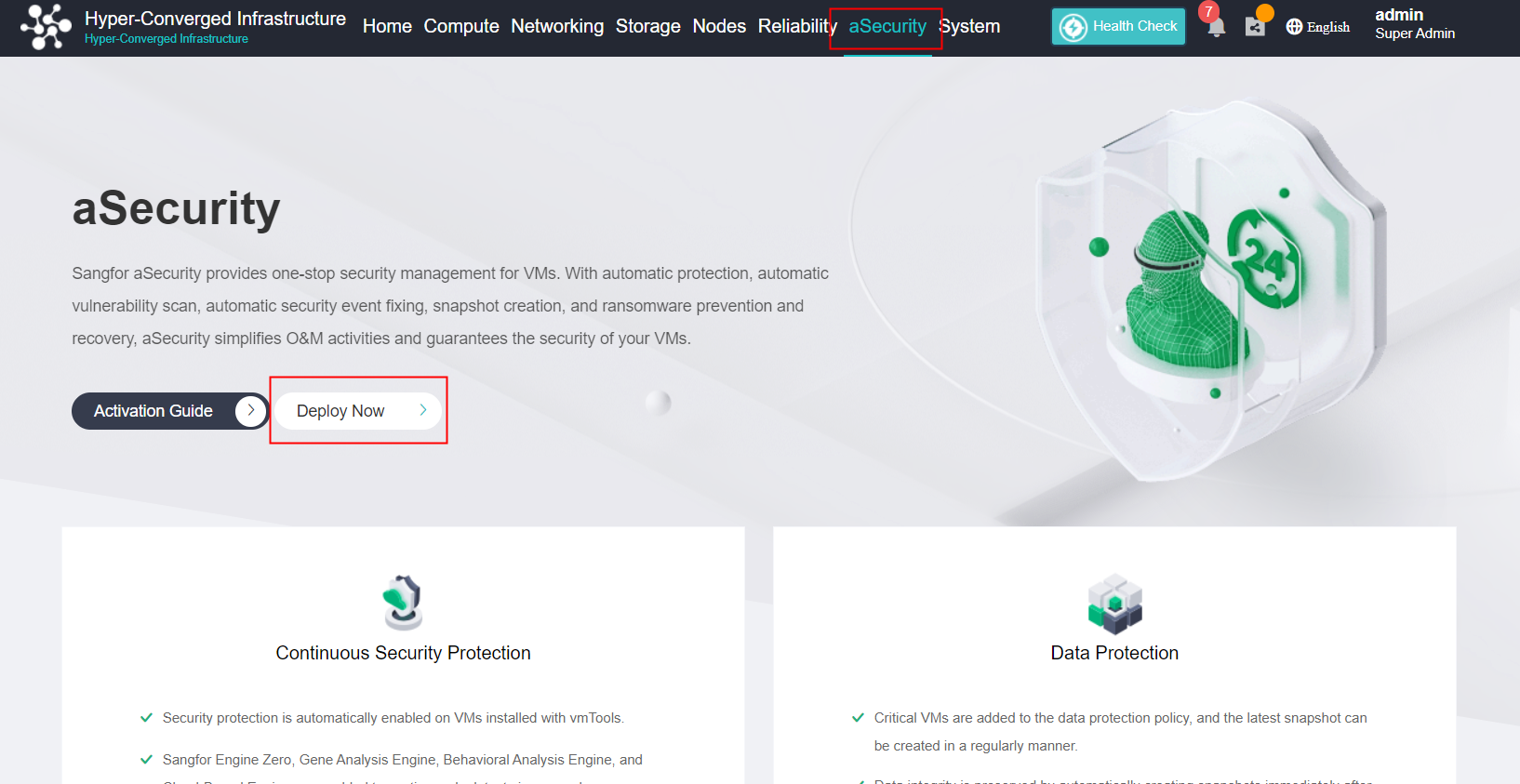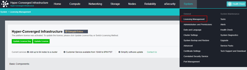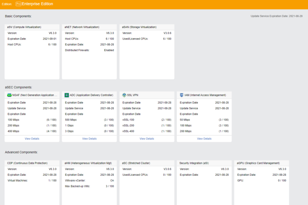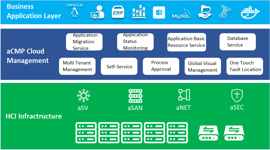 HCI has four main components: aSV (server virtualization), aNET (network virtualization), aSAN (storage virtualization), and aSEC (security virtualization and NFV). aSV is the kernel of the whole HCI and is a required option. aNET, aSAN and aSEC can be selected from three or all according to specific requirements.