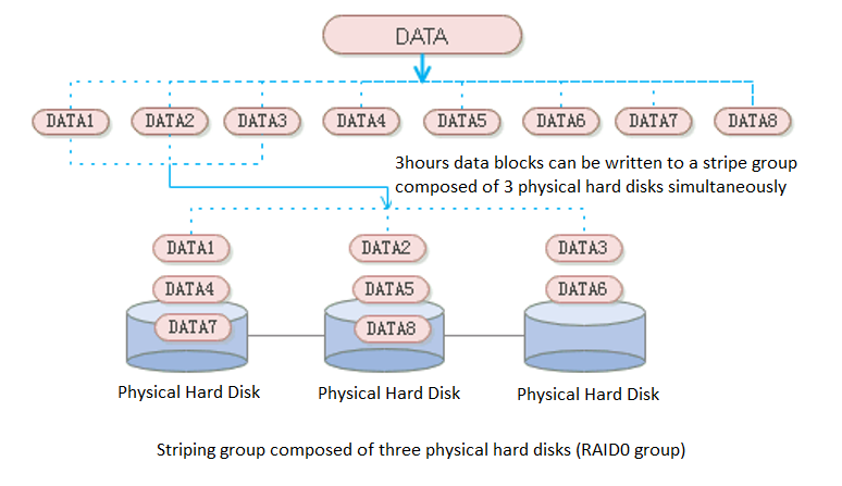 aSAN uses striping technology to maximize I/O concurrency. Striping technology is to cut a piece of continuous data into many small data blocks and then stores them concurrently on different physical hard disks to achieve the maximum I/O concurrency when writing or reading data to obtain excellent performance.