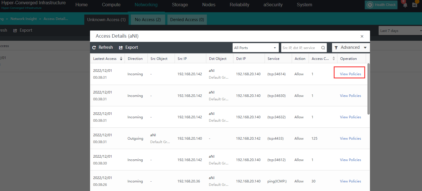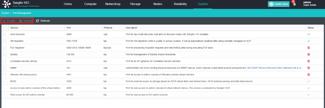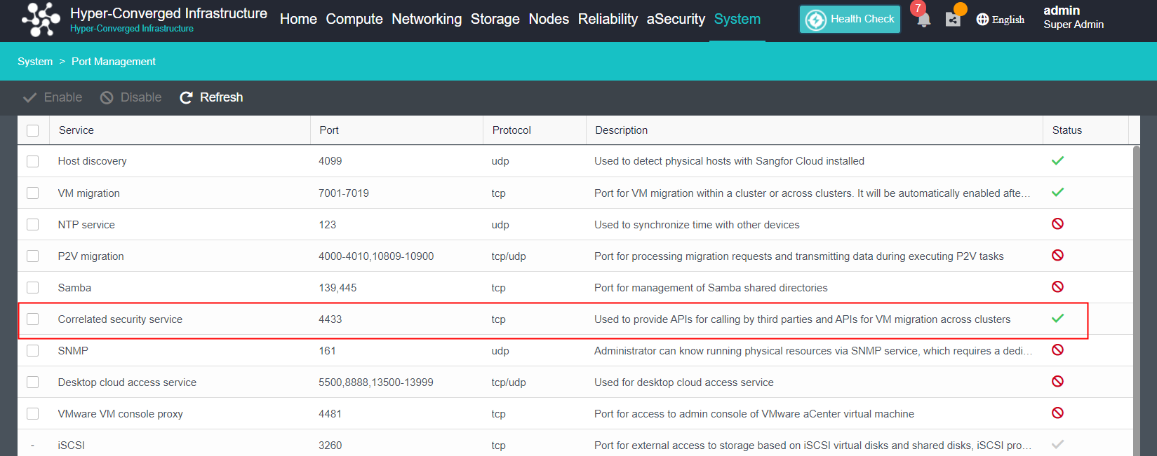 | HCI | any | HCI | 7001-7019 | tcp | For intra-cluster and cross-cluster virtual machine migration. This port will be automatically enabled when the cloud management platform manages the cluster. |