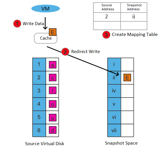 After the snapshot is created, all new data and modifications to the source data of the virtual machine will be written to the newly generated snapshot space. The corresponding relationship between the logical address of the source virtual disk and the snapshot space will be written in the mapping table.