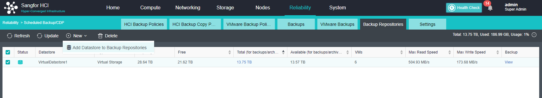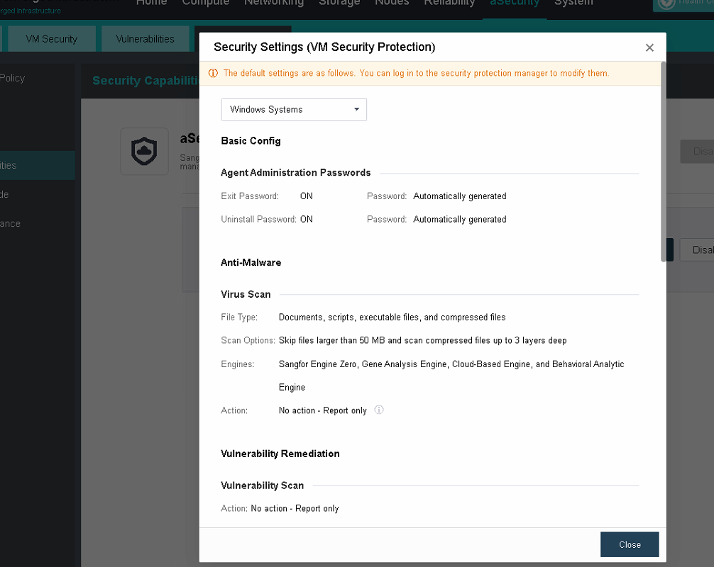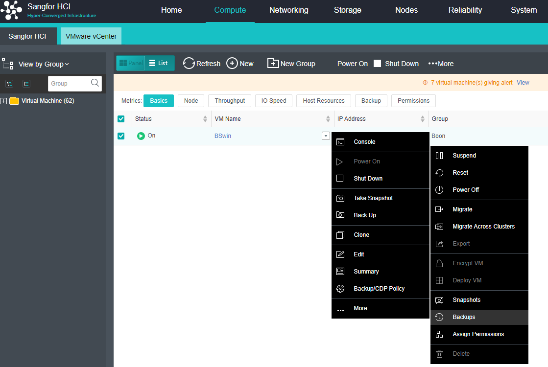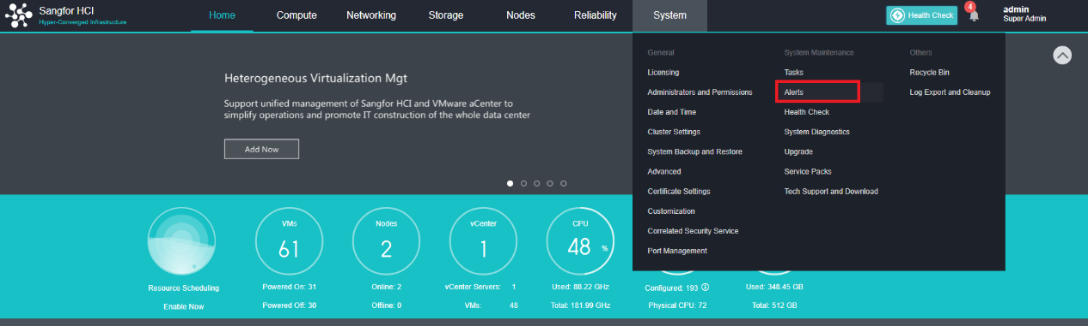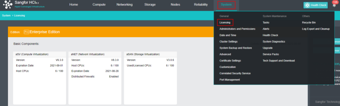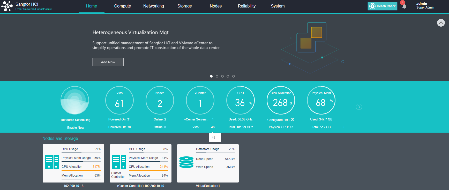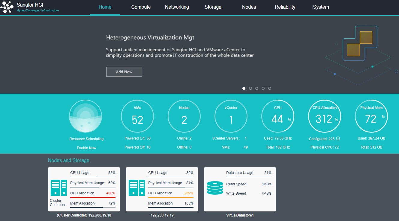Sangfor SCP can provide rich management functions, including hosting HCI clusters and VMware vCenter, supporting unified licensing for multiple HCI clusters, and supporting multi-tenant management and independent service management. In terms of security, support tenants to configure their own distributed firewall policies. In terms of disaster recovery, SCP integrates the reliability center, which can provide users with a complete remote disaster recovery scheme at the virtual machine level.