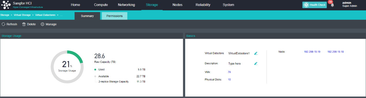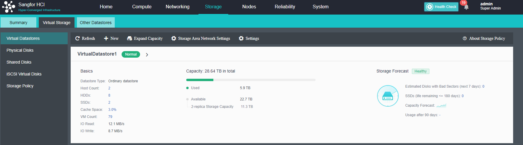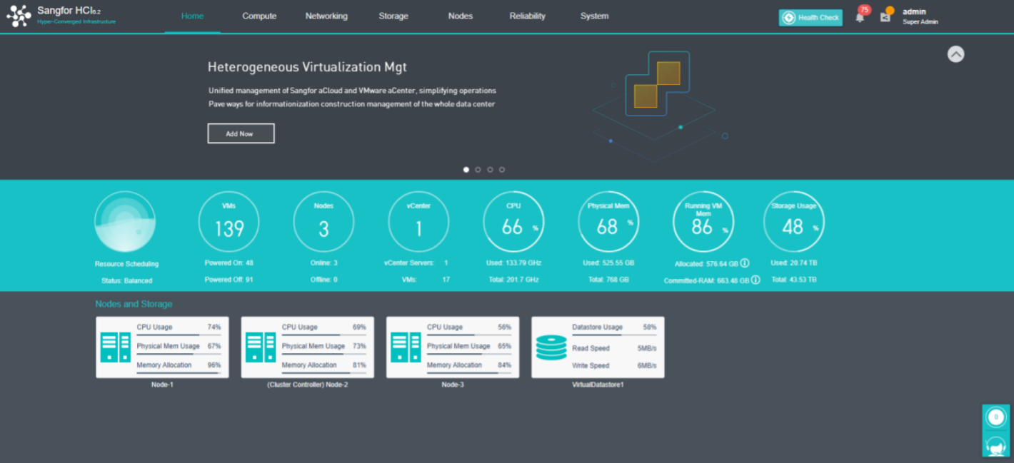 Relying on HCI technology, HCI simplifies the data center into two kinds of equipment: x86 server and switch, which reduces the initial investment cost and the cost of learning to use the equipment. Smooth capacity expansion is realized by accessing the SCP cloud computing platform to support the demand for high-performance services. HCI has a built-in P2V migration tool, which can realize one-click migration of applications to the cloud and improve its innovation efficiency. HCI ensures data reliability through CDP technology, data multi-copy technology, virtual machine backup technology, application data backup, network behavior management, and other technologies. It has unique optimization technology for key applications, supports the stable operation of key businesses of Oracle RAC cluster, SQL server AlwaysOn cluster, Kingdee, UFIDA, and ERP software, and can meet the needs of the ultra-high reliable business. The built-in firewall, WAF, cloud antivirus, and other business applications running on the cloud platform make them have a perfect security protection system, meet the security and compliance requirements, and effectively prevent East-West security threats in the data center. HCI has global resource management capability. It deploys and configures what you draw is what you get, reduces application deployment time, fault location, and repair time, and can master the use method of the platform without special training.