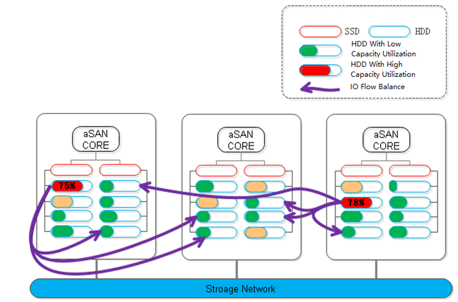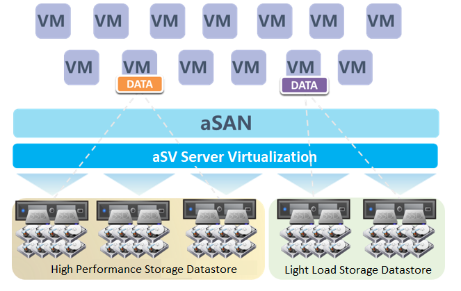 aSAN is a self-developed distributed storage system. It uses virtualization technology to "pool" the local hard disk in the general x86 server in the cluster’s virtual datastore to realize the unified integration, management, and scheduling of server storage resources. Finally, it provides the upper layer with NFS / iSCSI storage interface for virtual machines to freely allocate and use the storage space in the resource pool according to their storage requirements.