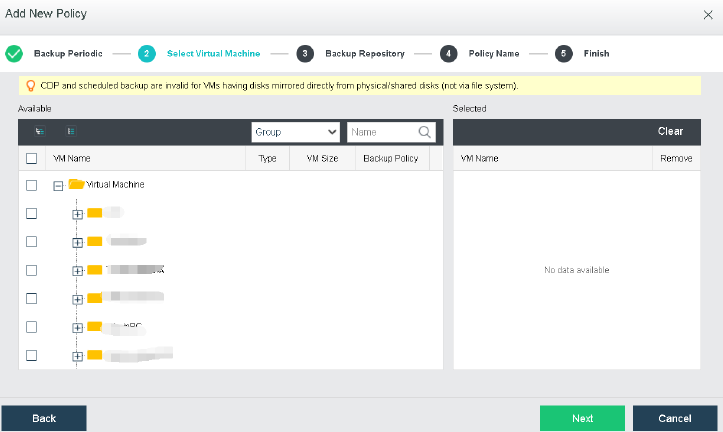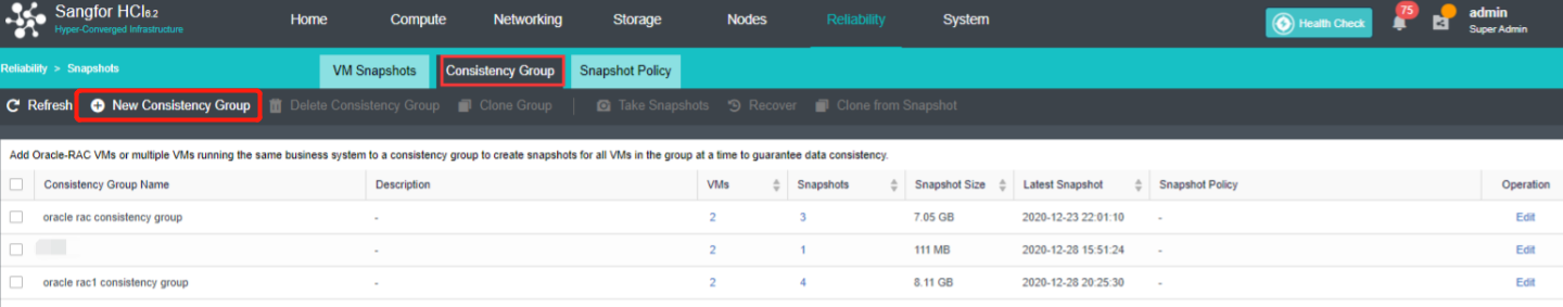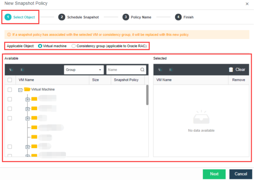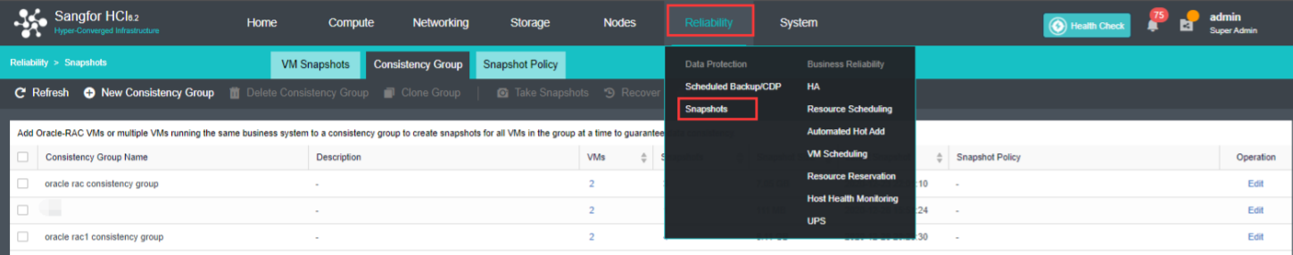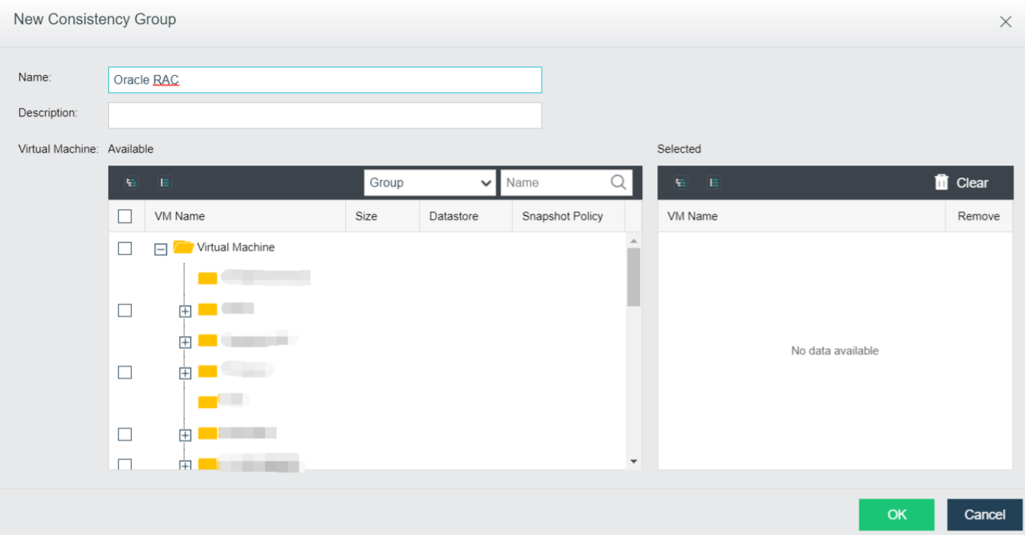- Support adding virtual machines in Oracle RAC or multiple virtual machines hosting the same business system as consistency groups. Take snapshots for consistency groups to ensure that all virtual machines in the group take snapshots simultaneously.
