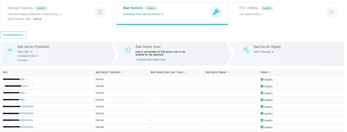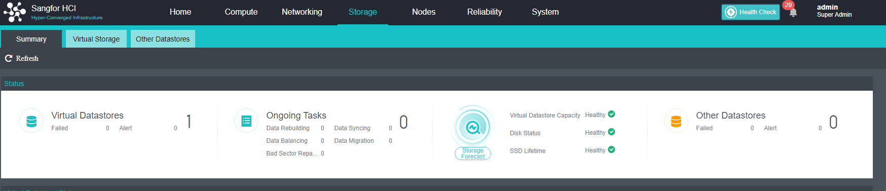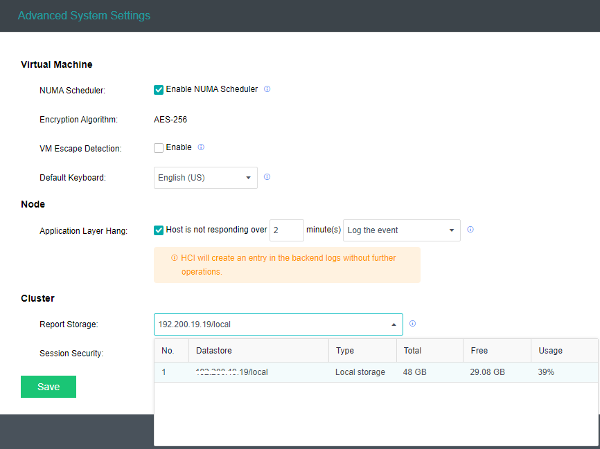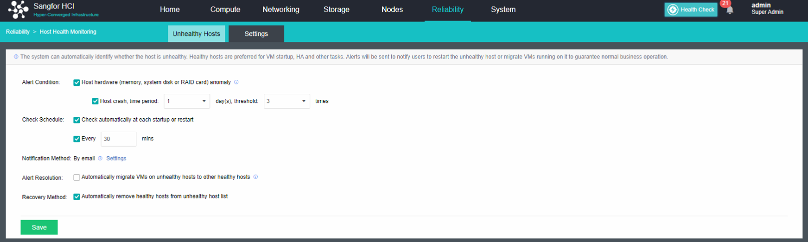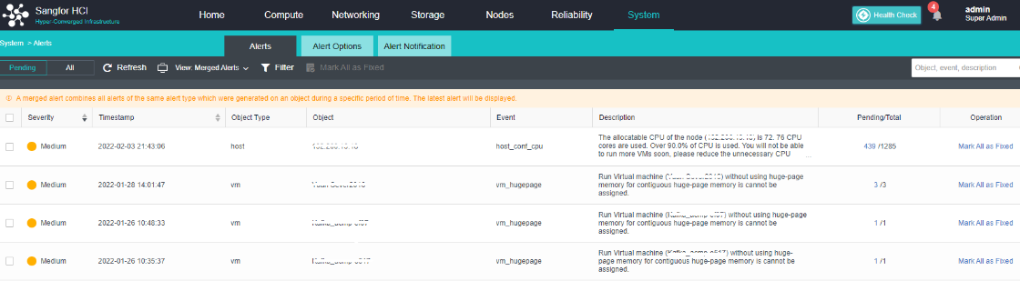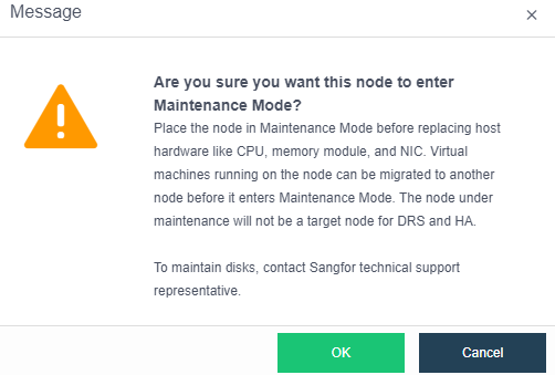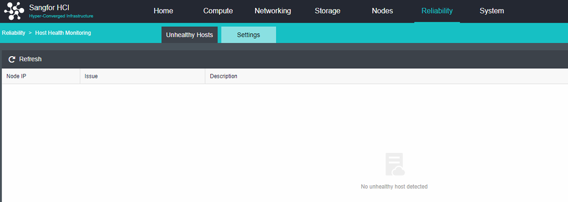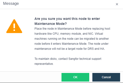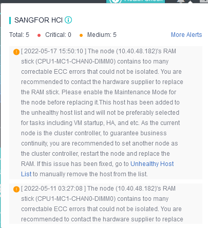 Monitor whether the system disk and memory of the node in the cluster are in the sub-health state, give treatment opinions to the sub-health node and reduce the priority of the sub-health node in the process of virtual machine startup (or HA) node selection. Currently, it supports processing five sub-health states: memory CE and UE errors on the node, read-only system disk, insufficient SSD lifetime, and bad channel on HDD.