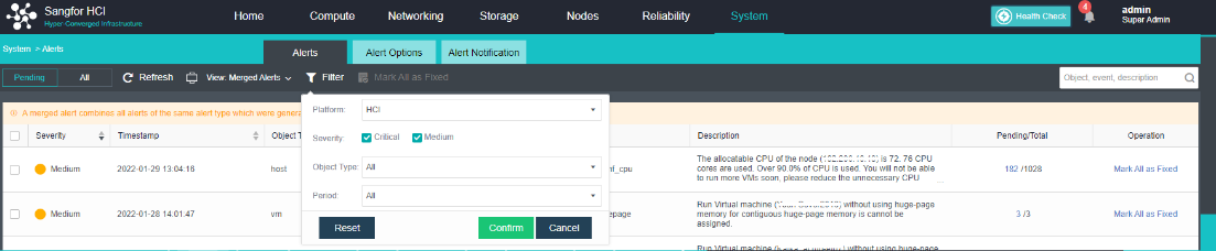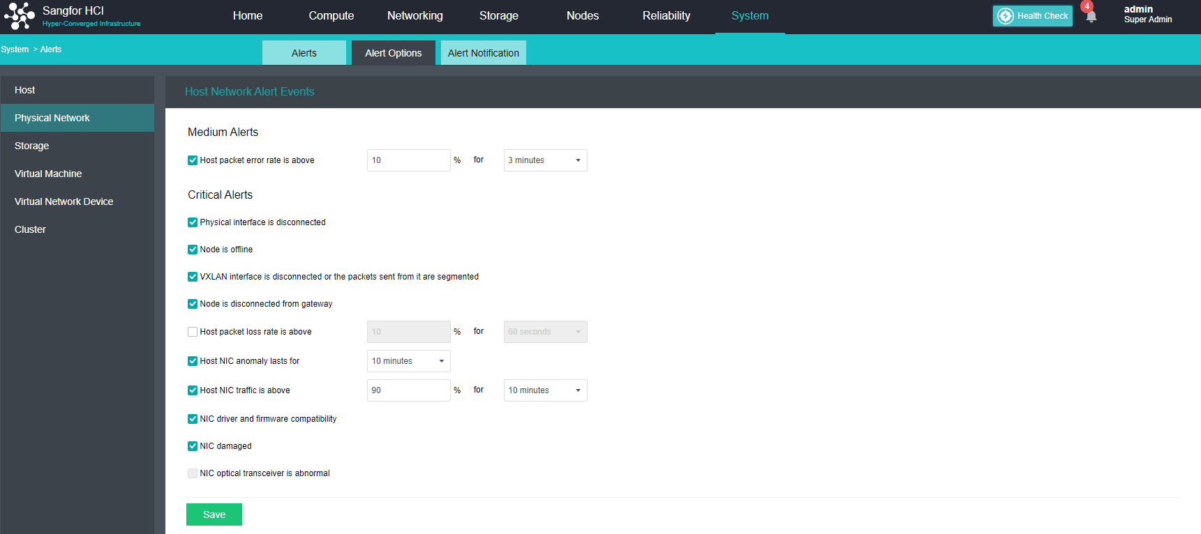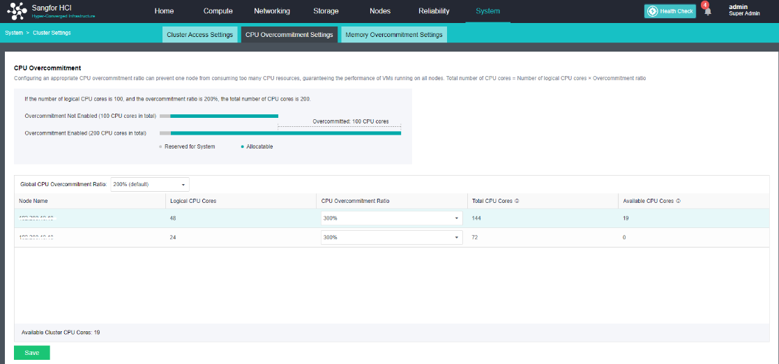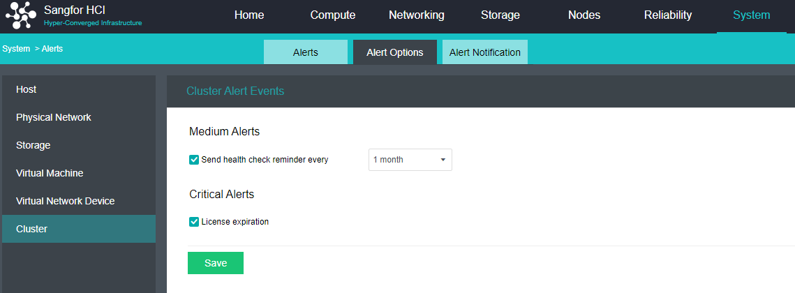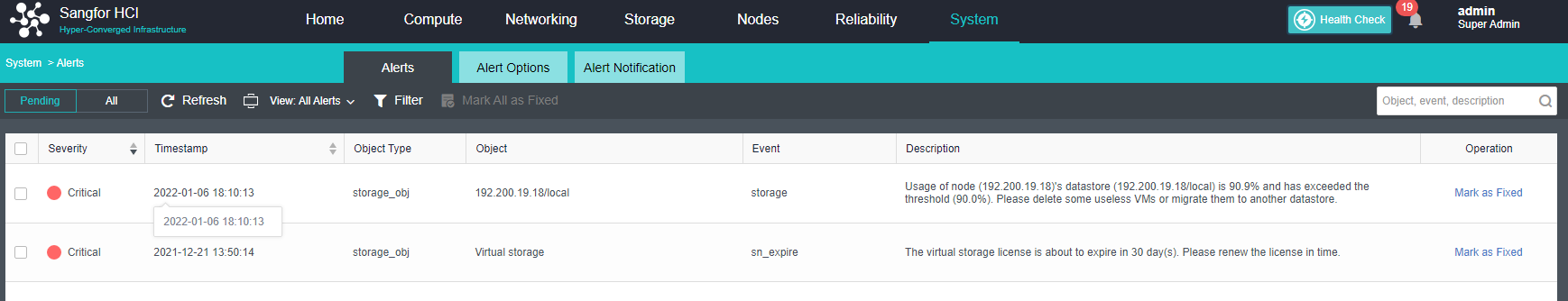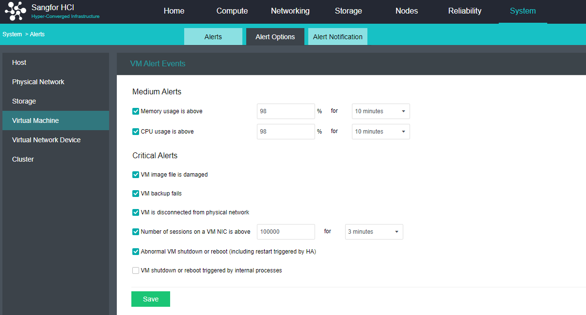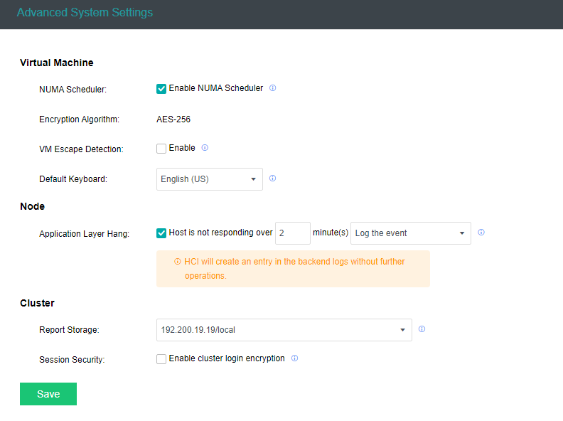 Monitor whether the system disk and memory of the node in the cluster are in the sub-health state, give treatment opinions to the sub-health node and reduce the priority of the sub-health node in the process of virtual machine startup (or HA) node selection. Currently, it supports processing five sub-health states: memory CE and UE errors on the node, read-only system disk, insufficient SSD lifetime, and bad channel on HDD.