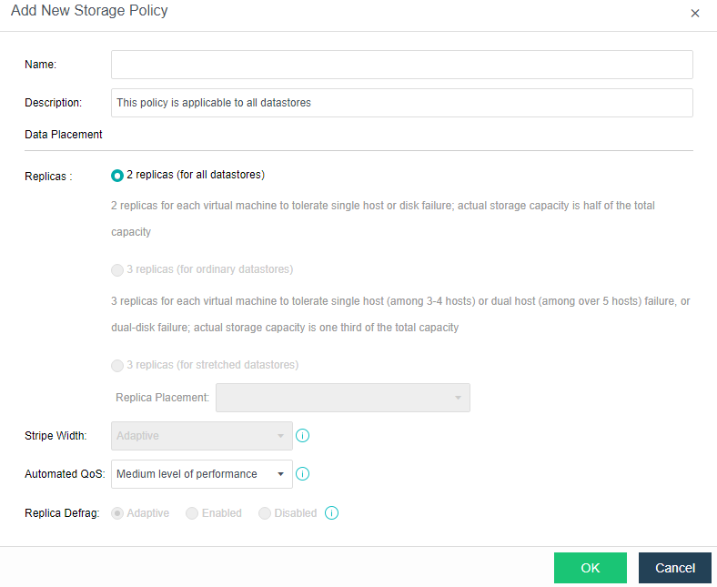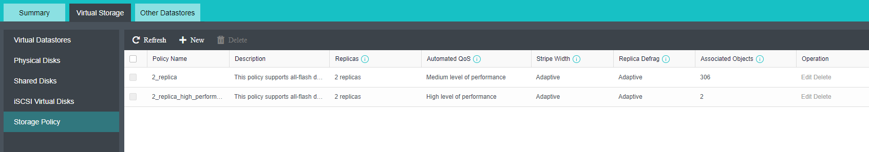Common storage strategies are built in the platform. Users can select corresponding storage policies when creating virtual machines according to the characteristics of business systems. At the same time, users can configure more detailed storage policies with the virtual machines as granularity according to the characteristics of the business system, which makes the configuration more flexible. Contains the following four attributes: