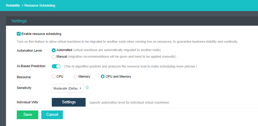 Resource scheduling refers to scheduling cluster resources in specific scenarios, migrating virtual machines from nodes with high CPU or memory usage to nodes with low utilization, and reducing the utilization of nodes with an excessive load below the threshold.